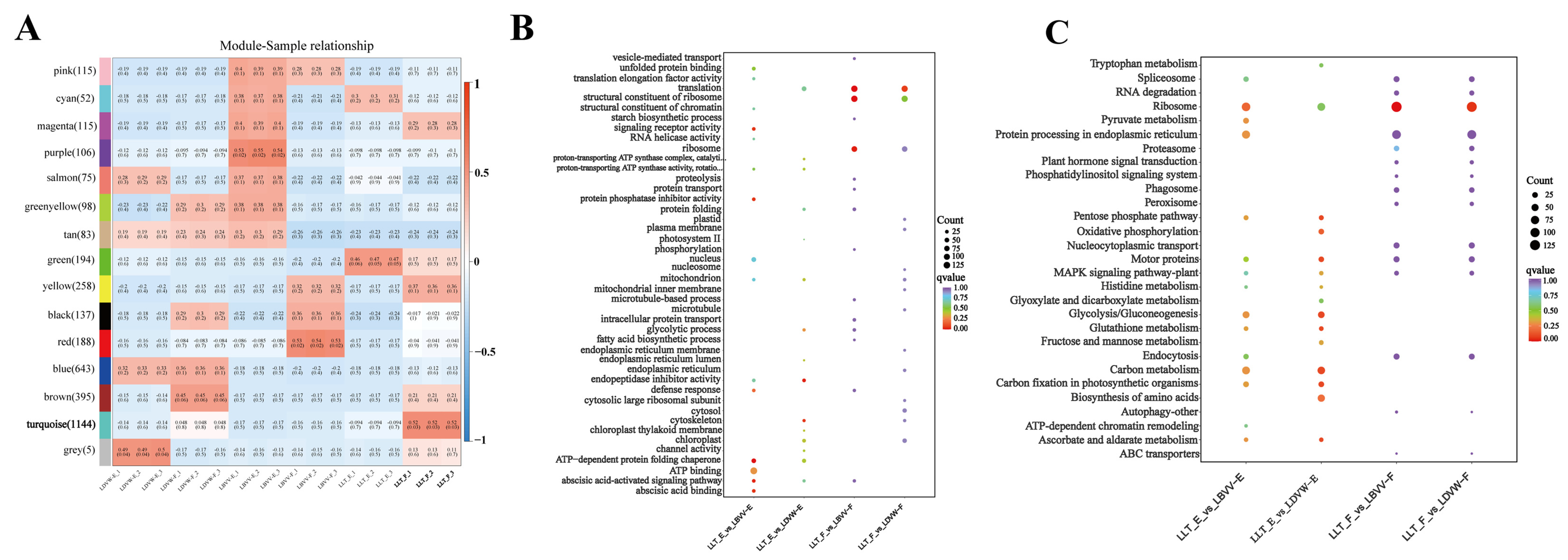WPCNA identified a turquoise module containing 1144 peptides that showed a significant correlation with LLT_F (r = 0.52, p = 0.03; Figure 2A). GO enrichment analysis of differential peptides in LLT_F revealed ribosomal functions, including structural components of ribosomes and translation (Figure 2B). These findings indicate enhanced translational activity that may generate bitter precursors via hydrophobic residues, particularly leucine/isoleucine-rich motifs. Further KEGG analysis enriched endoplasmic reticulum protein processing, nucleocytoplasmic transport, and MAPK signaling pathways (Figure 2C). Electronic tongue analysis of total peptides extracted from six groups demonstrated that LLT_F exhibited the highest bitterness intensity at an equivalent concentration. Based on electronic tongue analysis, the fleshy layer of LLT_F was the most bitter among the six sample groups with LBVV_F ranking second. No obvious bitterness was detected in any of the epidermal tissues (Tables S5 and S6).