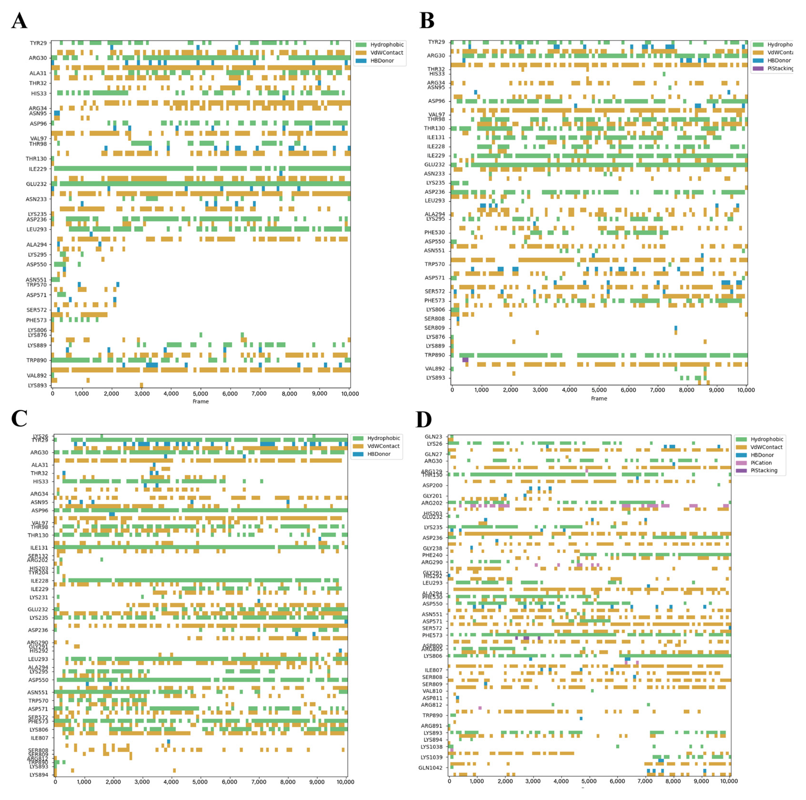 Asp96, Glu232, and Trp890 emerged as critical mediators of van der Waals interactions throughout the 100 ns MD trajectories with substantial contact maintained to all four peptides despite their divergent binding profiles. Pepetide A maintained stable contacts with Arg30, Ile229, Glu232, Leu293, and Trp890 (Figure 4A). Peptide B primarily affected Tyr29, Arg30, Asp96, Thr98, Glu232, and Trp890 (Figure 4B). Peptide C formed additional stable interactions with Phe573 and Lys806 beyond conserved residues (Figure 4C). Peptide D achieved dynamic stability through Thr130, Lys235, Leu293, and Arg571 (Figure 4D). MM/GBSA analysis of the 90–100 ns equilibrium trajectory quantified the binding free energies for Peptide A, B, C, and D systems as −101.9, −87.72, −129.69 and −141.67 kcal/mol.