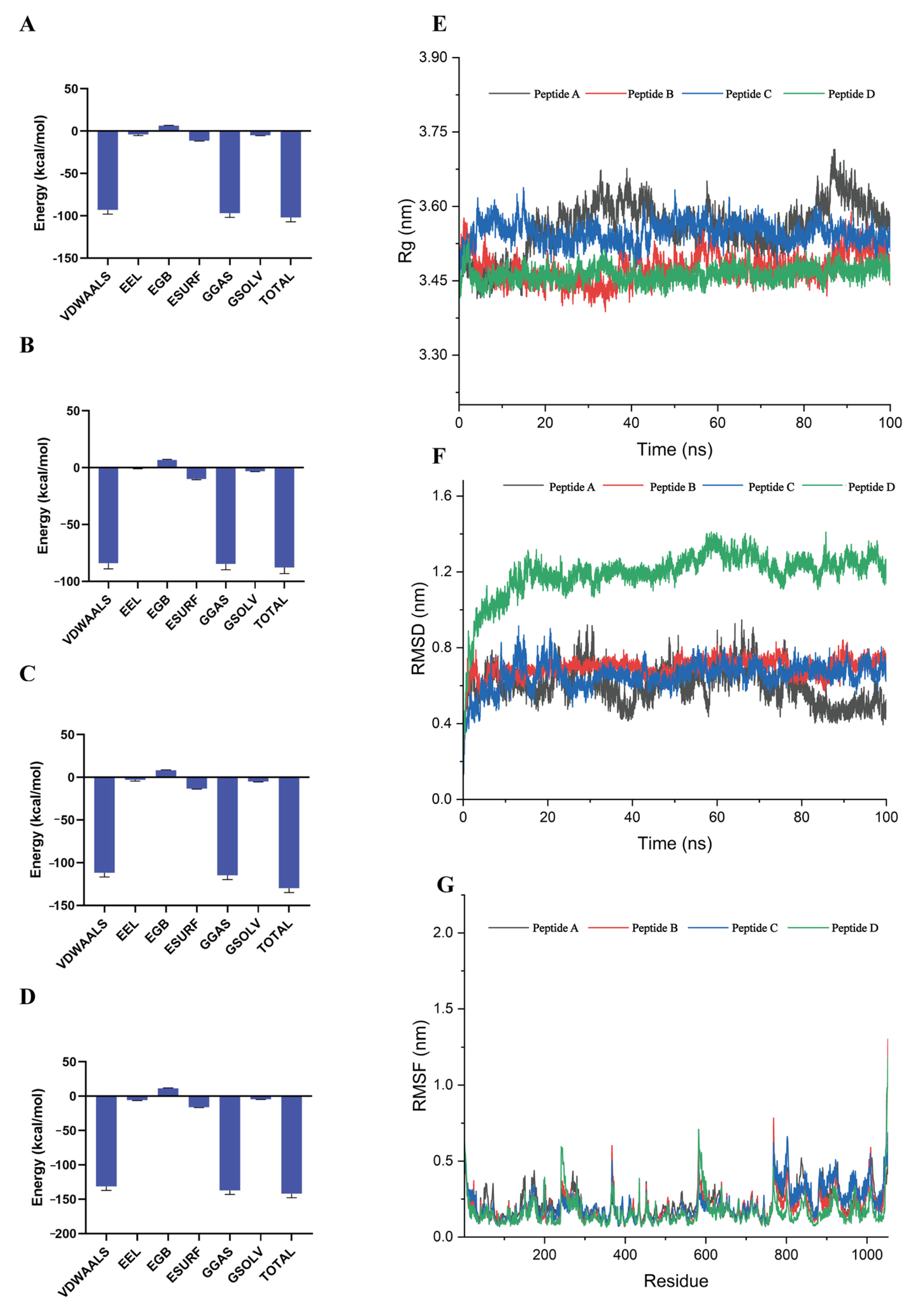 Figure 5. Analysis of Binding Free Energy and Structural Dynamics in Bitter Peptide-TAS2R14 Complexes: MM/GBSA and Conformational Stability Metrics. (AD): MM/GBSA Binding Free Energy Profiles of Bitter Peptides (AD) in Complex with TAS2R14. (EG): Conformational Dynamics of Bitter Peptides (AD): Global Structural Compactness, Backbone Stability, and Residue Flexibility.