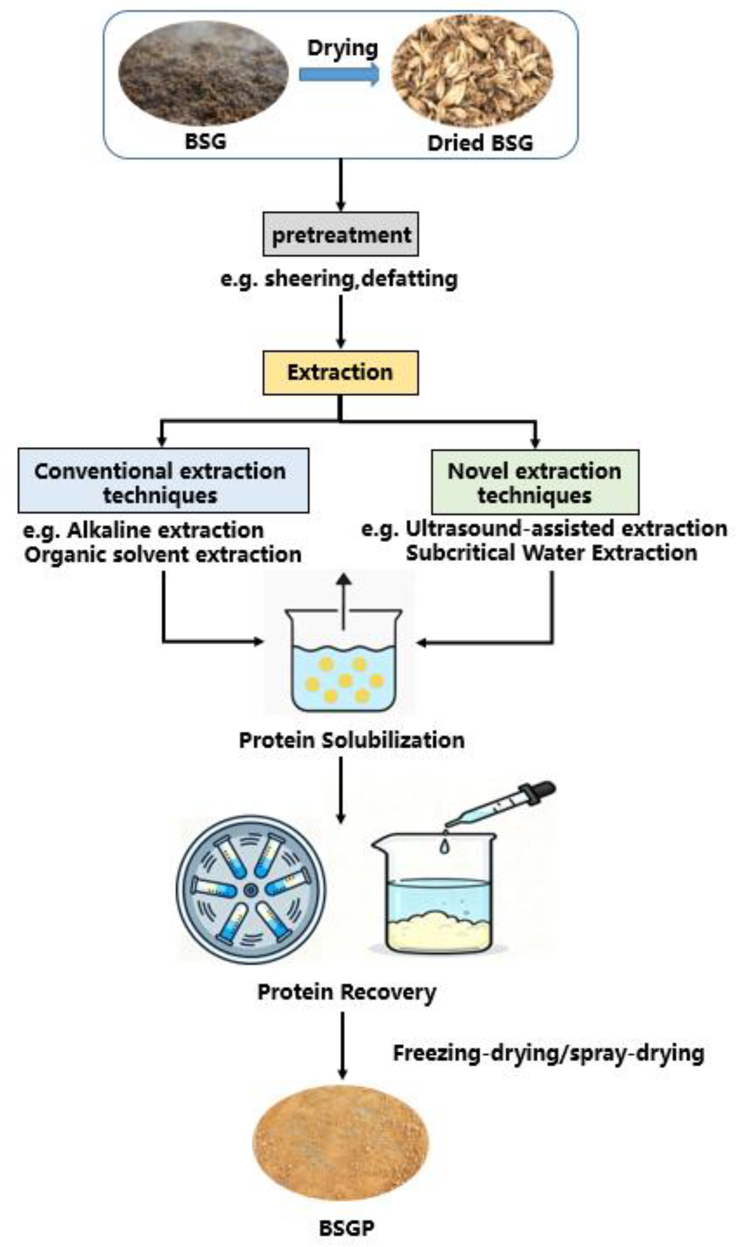 - Chin, Y.L.; Keppler, J.K.; Dinani, S.T.; Chen, W.N.; Boom, R. Brewers’ spent grain proteins: The extraction method determines the functional properties. Innov. Food Sci. Emerg. Technol. 2024, 94, 103666. [Google Scholar] [CrossRef]