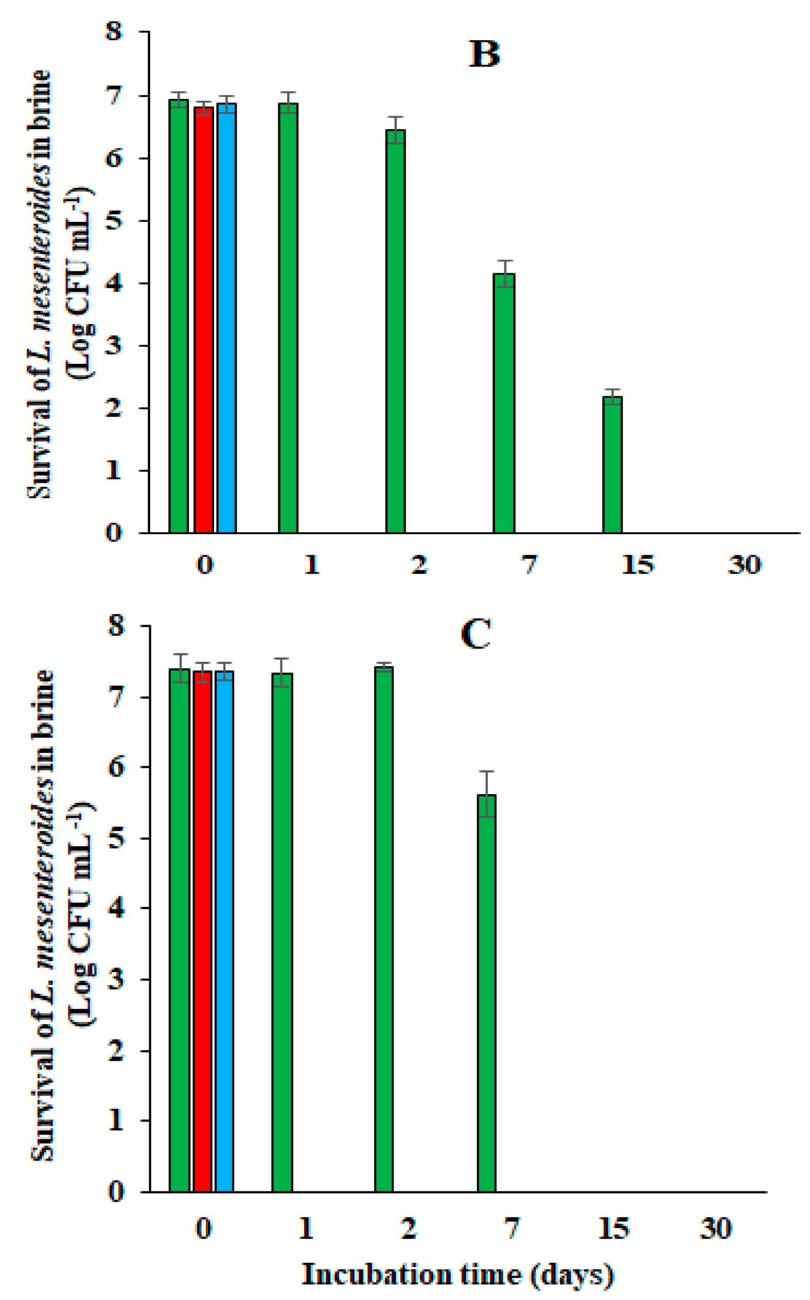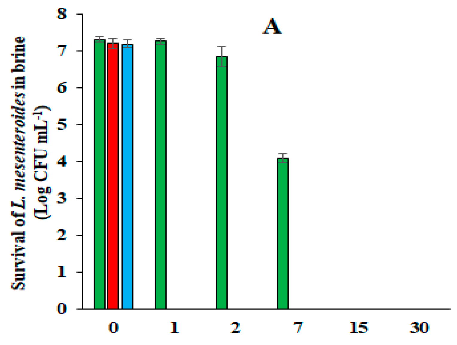 2.7. Evaluation of Resistance of Leuconostoc Mesenteroides to Acidified Brine