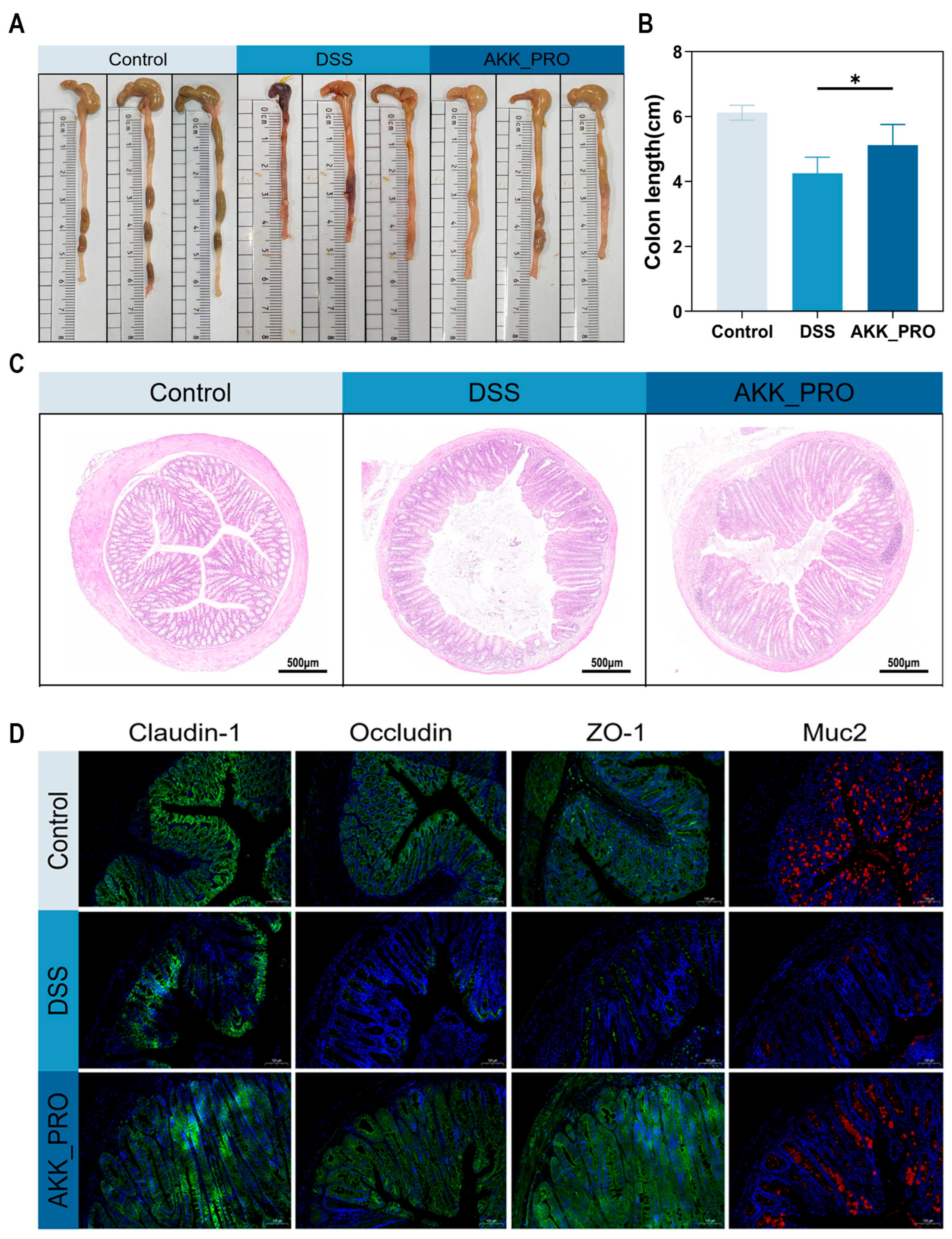 3.2. Ingestion of Inactivated AKK PROBIO Alleviates Colonic Damage in DSS-Induced Mouse UC