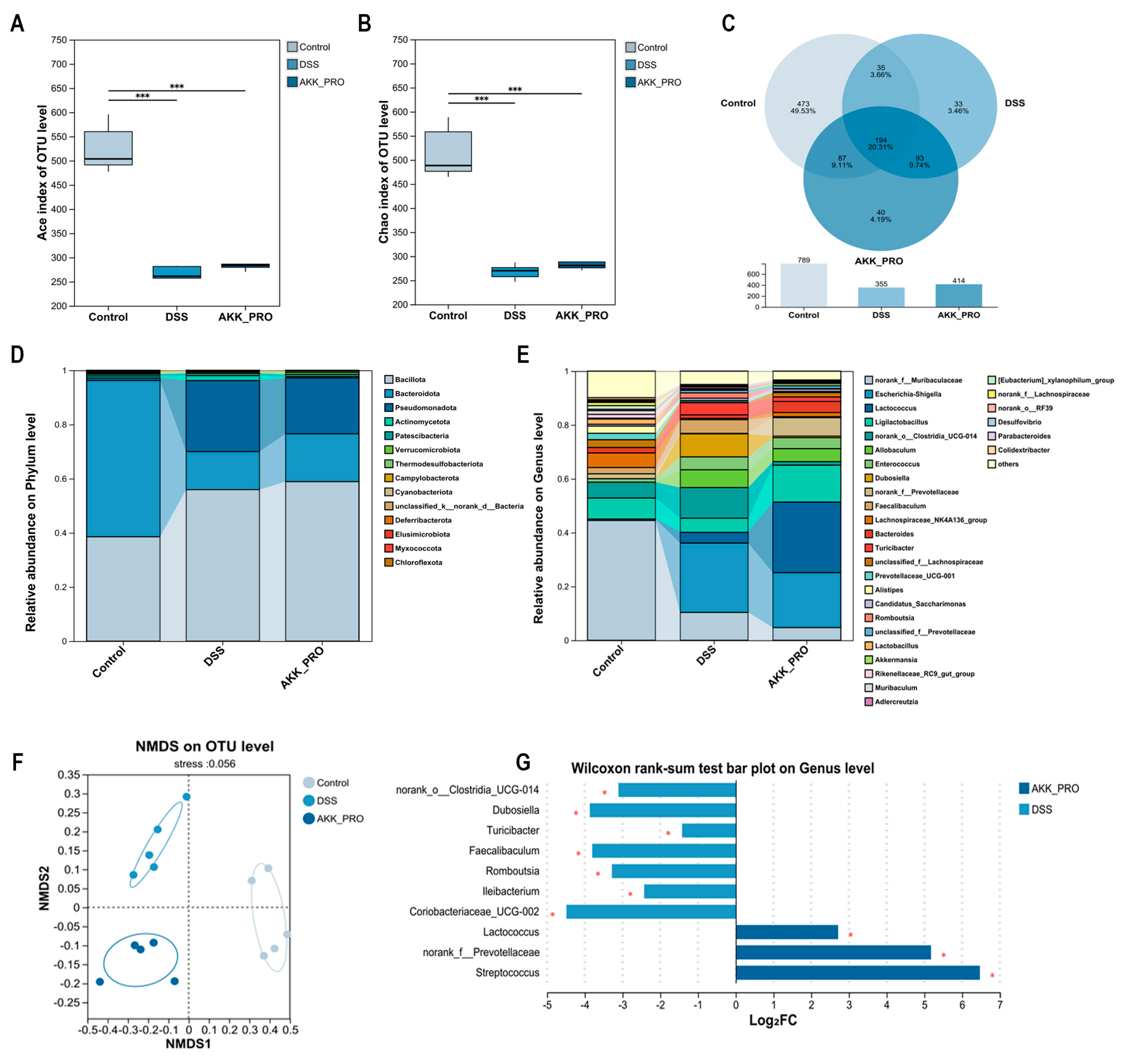 3.3. Ingestion of Inactivated AKK PROBIO Reduces Inflammatory Cytokines and Alters Gut Microbiota Composition in DSS-Induced UC in Mice