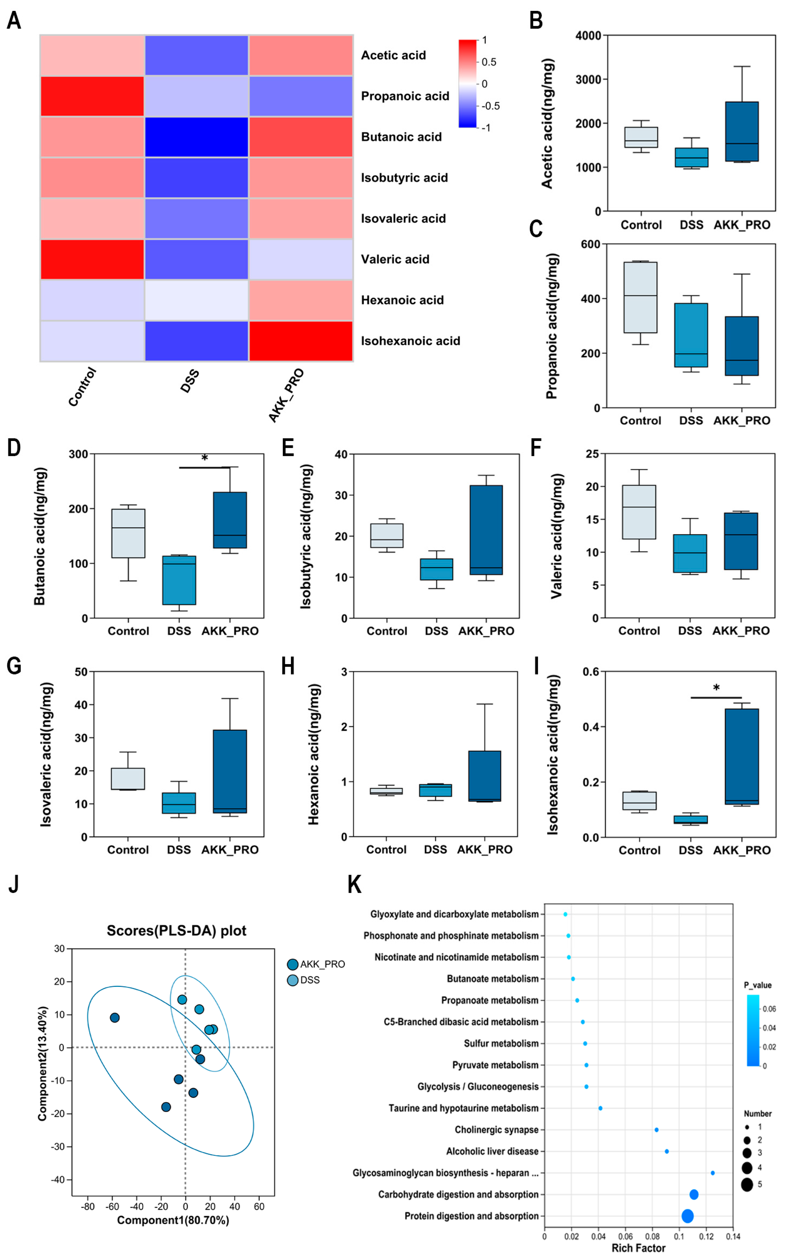 3.5. Intake of Inactivated AKK PROBIO Increased SCFA Levels in DSS-Induced Ulcerative Colitis Mice