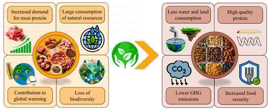 Therefore, insect farming might positively contribute to the sustainability of meat supplies for the coming future (Figure 1). Applying a circular economy model would convert food waste into high-quality proteins that are potentially usable to replace fishmeal and soybean meal in livestock diets [,]. This approach ensures food security by providing alternative meat proteins, a different type of feed for livestock, improved food production, and the release of farmland. This scenario might promote new profitable opportunities for small farmers and contribute to rural development [].