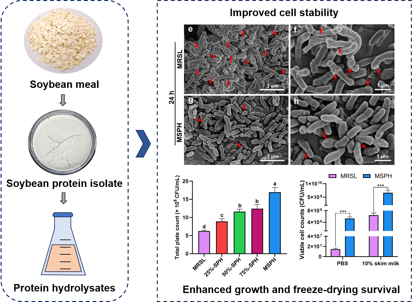 The study proposed a strategy using soybean protein hydrolysate (SPH) as the sole nitrogen source for promoting the proliferation and freeze-drying survival of Bifidobacterium breve and Bifidobacterium longum strains. High proportions of SPH replacing traditional nitrogen sources in MRSL significantly enhanced bacterial viable cell counts and OD600 values. The small peptides (<3 kDa) and hydrophilic amino acid residues in SPH are considered to be the key factors for promoting bacterial growth. The exclusive use of SPH (100%-SPH) as the nitrogen source induced a morphological change in B. breve 1206 with the Y-shape transformation into smaller rod-shaped cells, while B. longum 070103 and 050101 became shorter rods. Cells with these morphological changes could more effectively maintain cell membrane integrity in an acidic condition and during the freeze-drying process. Consequently, MSPH improved cell viability and freeze-drying survival for B. breve 1206 in PBS and 10% skim milk compared to MRSL. It also significantly increased viable cell counts and the ability to survive freeze-drying for functional B. longum strains 070103 and 050101 in 10% skim milk, with survival rates increasing by 16.2% and 43.1%, respectively. These results showed the applicability of SPH in the industrial-scale cultivation of functional Bifidobacterium strains. It also provides new insights into soybean-derived nitrogen sources that can affect amino acid composition and bacterial morphology to enhance probiotic stability. This study supported the application of soybean peptides as the sole nitrogen source for producing high-viability probiotics and the potential prebiotic with health benefits.