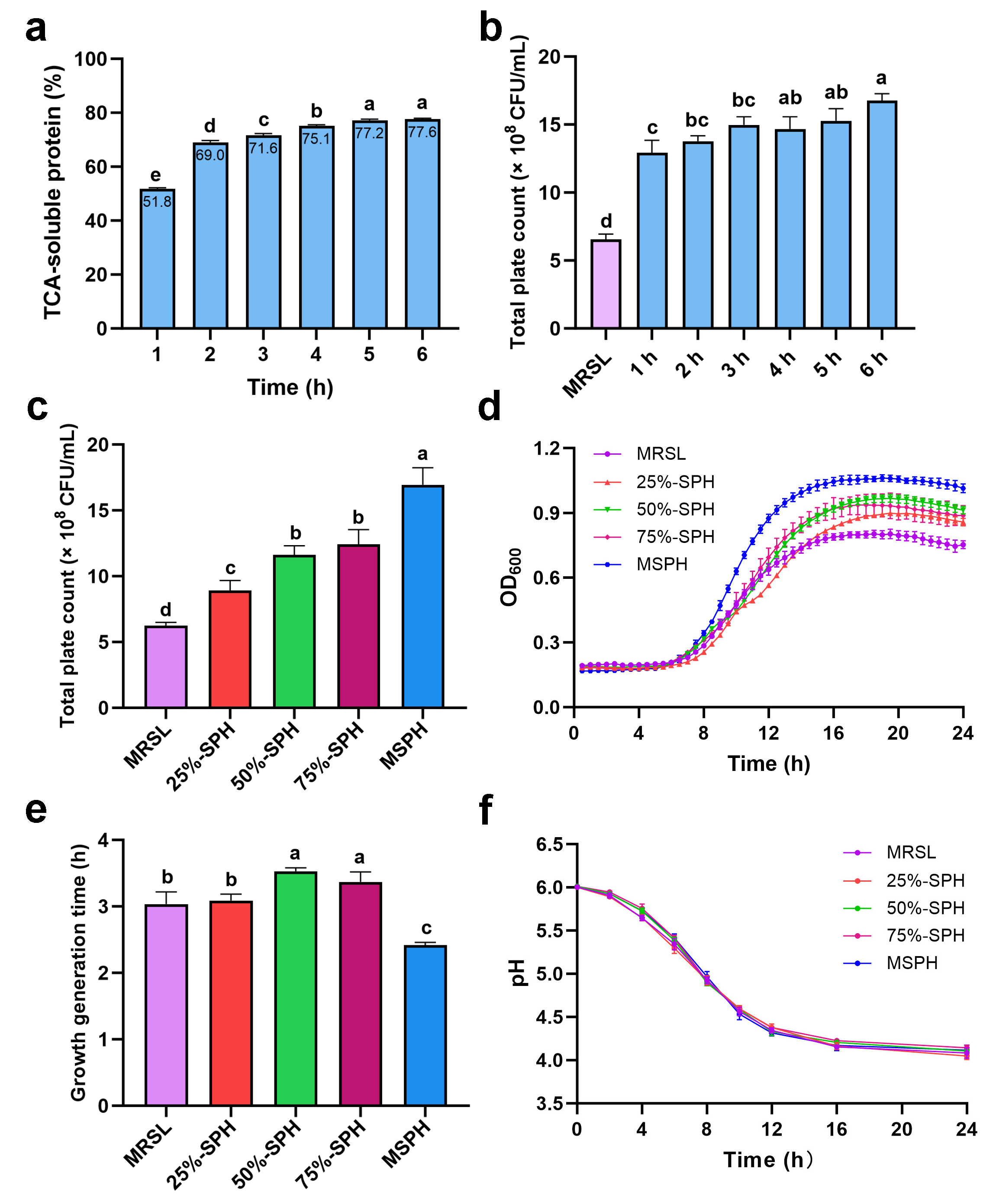 Figure 2. (a) Trichloroacetic acid (TCA)-soluble protein contents in SPH samples hydrolyzed for 1 to 6 h; (b) total plate count of B. breve 1206 cultured in MRSL and different SPHs (1 to 6 h) as sole nitrogen source for 24 h; (c) growth curves; (d) total plate count at 24 h; (e) growth generation time; and (f) pH changes in B. breve 1206 cultured of different medium groups (MRSL, 25%-SPH, 50%-SPH, 75%-SPH, and 100%-SPH (MSPH)) prepared by soy protein isolate hydrolysates. Different letters among groups indicate significant differences at p < 0.05 (SPSS analysis).