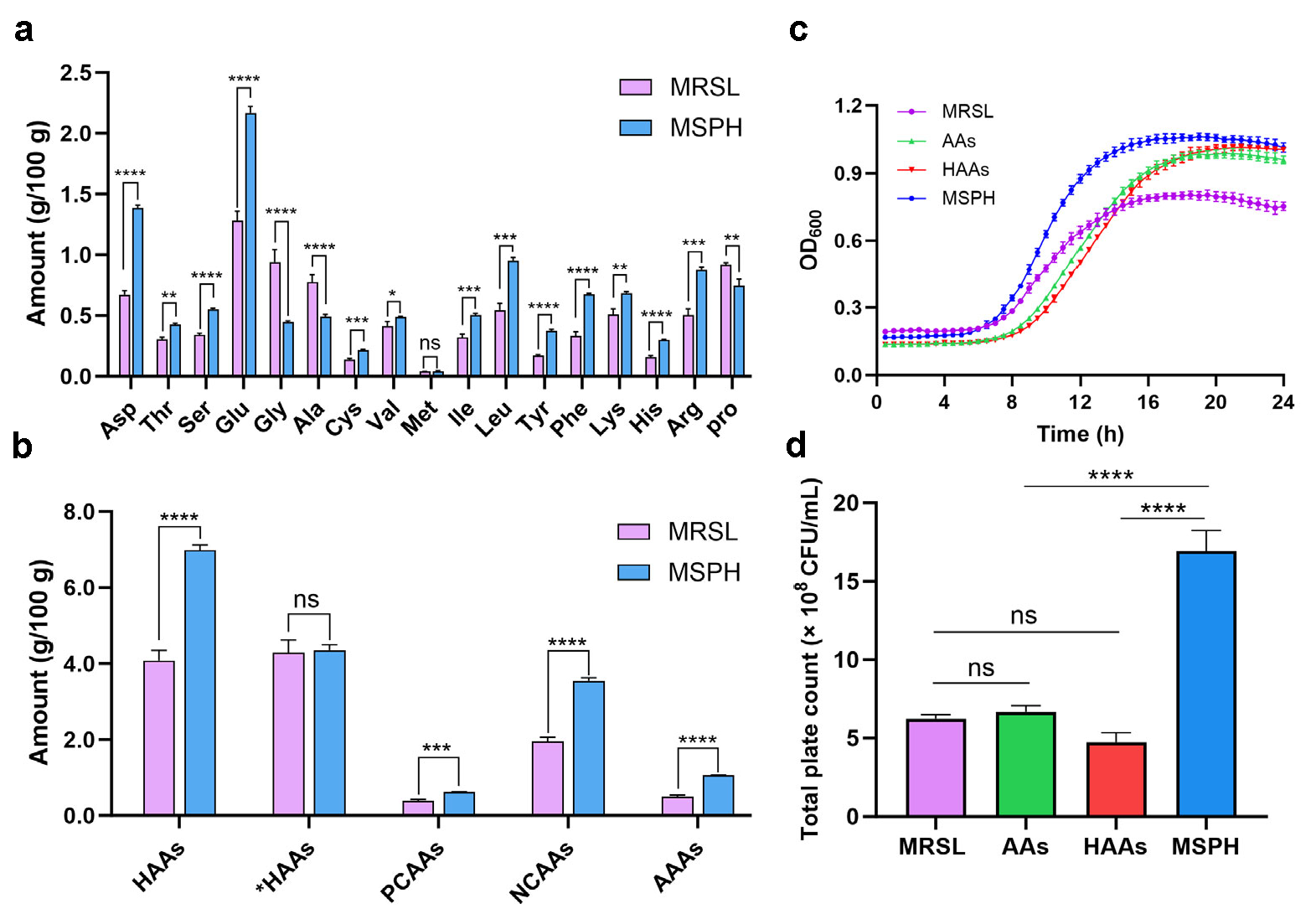 Figure 3. (a) Amino acid composition and (b) contents of amino acids by category in MRSL and MSPH medium. Hydrophilic amino acids (HAAs): Ser, Thr, Cys, Asp, Tyr, Glu, Tyr, Lys, Arg, His; hydrophobic amino acids (*HAAs): Ala, Val, Ile, Leu, Phe, Pro, Met, Gly; positively charged amino acids (PCAAs): Arg, His, Lys; negatively charged amino acids (NCAAs): Asp, Glu; aromatic amino acids (AAAs): Phe, Tyr; (c) growth curves; and (d) total plate count at 24 h for B. breve 1206 cultured in amino acids (AAs) and HAAs medium, in comparation with MRSL and MSPH. Statistical significance was evaluated using GraphPad Prism. The number of asterisks denotes the statistical significance level. ns indicates no significant difference, * indicates p < 0.05, ** indicates p < 0.01, *** indicates p < 0.001, and **** indicates p < 0.0001.