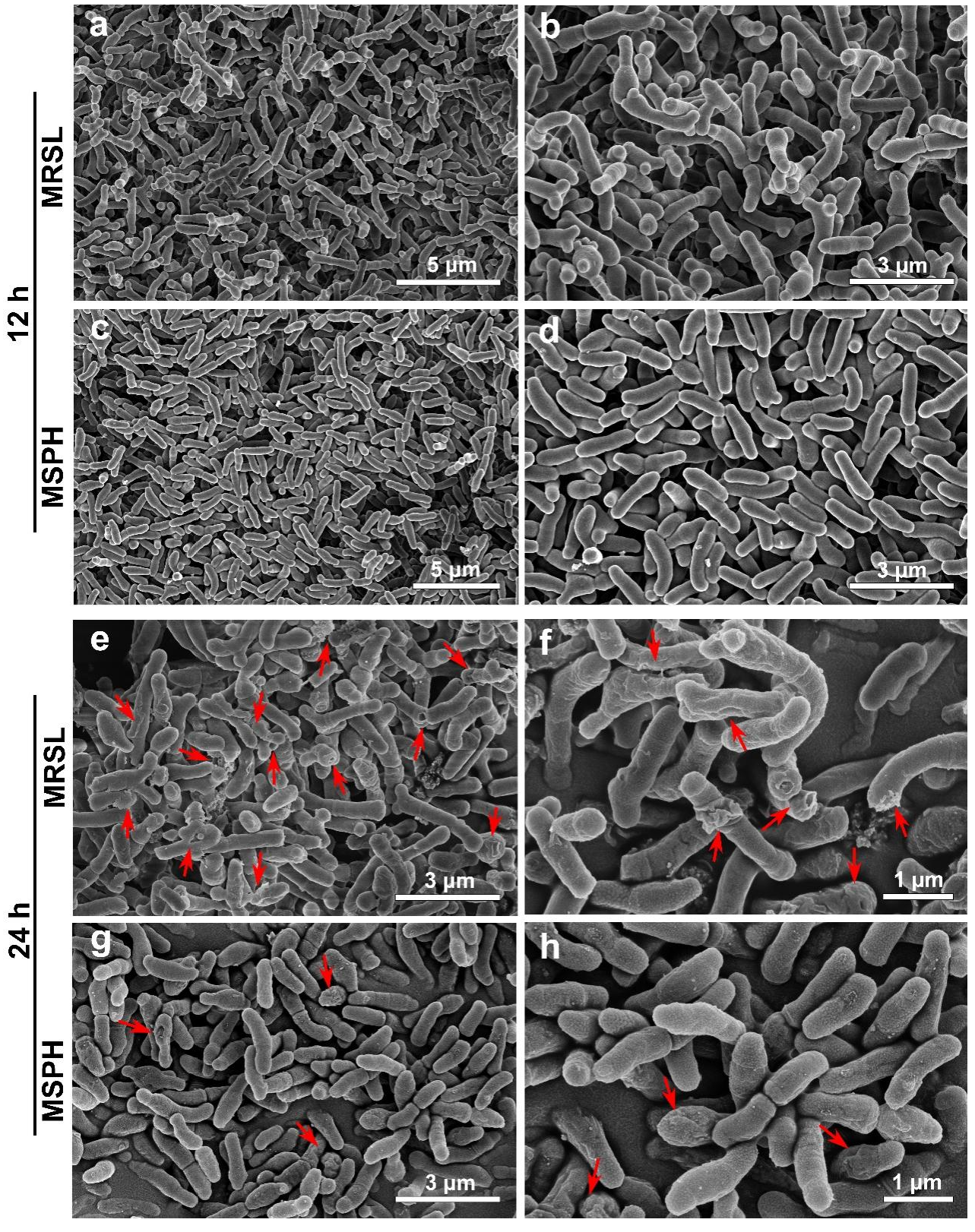 Figure 4. The SEM image of the B. breve 1206 cultured in MRSL and MSPH medium for (ad) 12 h and (eh) 24 h. Damaged regions of bacterial cells are marked by red arrows in SEM images.