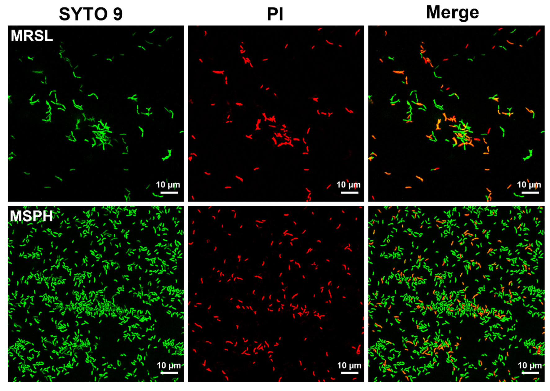 Figure 5. The cell viability of B. breve 1206 cultured in MRSL and MSPH for 24 h using confocal laser scanning microscopy. The live cells are green-stained with SYTO 9, while dead cells are red-stained with PI.