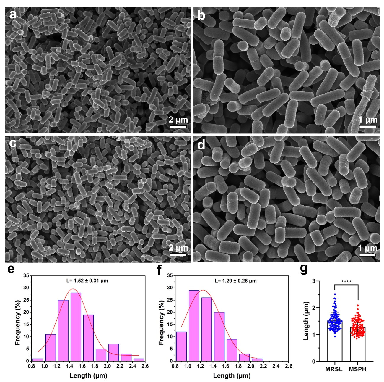 Figure 9. SEM images of B. longum 050101 after 24 h cultivation in (a,b) MRSL and (c,d) MSPH. Length distribution of 100 bacteria measured in (e) MRSL and (f) MSPH using Nano Measurer software; (g) statistical comparison of length distribution between MRSL and MSPH. **** indicates p < 0.0001.