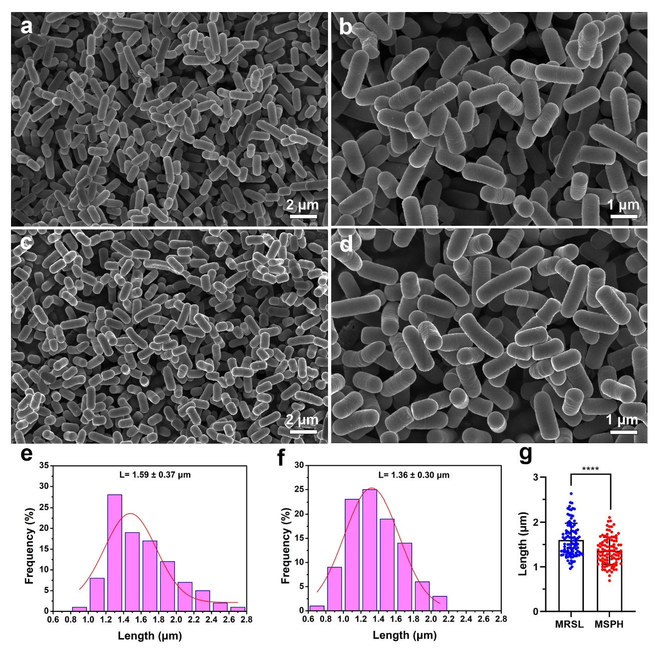 Figure 8. SEM images of B. longum 070103 after 24 h cultivation in (ab) MRSL and (cd) MSPH. Length distribution of 100 bacteria measured in (e) MRSL and (f) MSPH using Nano Measurer software; (g) statistical comparison of length distribution between MRSL and MSPH. **** indicates p < 0.0001.