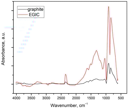 The FTIR spectra clearly show that the surface of exfoliated graphite is significantly richer in surface functional groups than the surface of pristine graphite. However, it should be noted that FTIR spectra do not allow for quantitative estimates. This inaccuracy can be compensated for by the results of the EDS analysis, which clearly show that, on average, the surface of exfoliated graphite consists of 95.5% carbon and 4.5% oxygen, while the surface of the pristine graphite consists of 99.8% carbon.