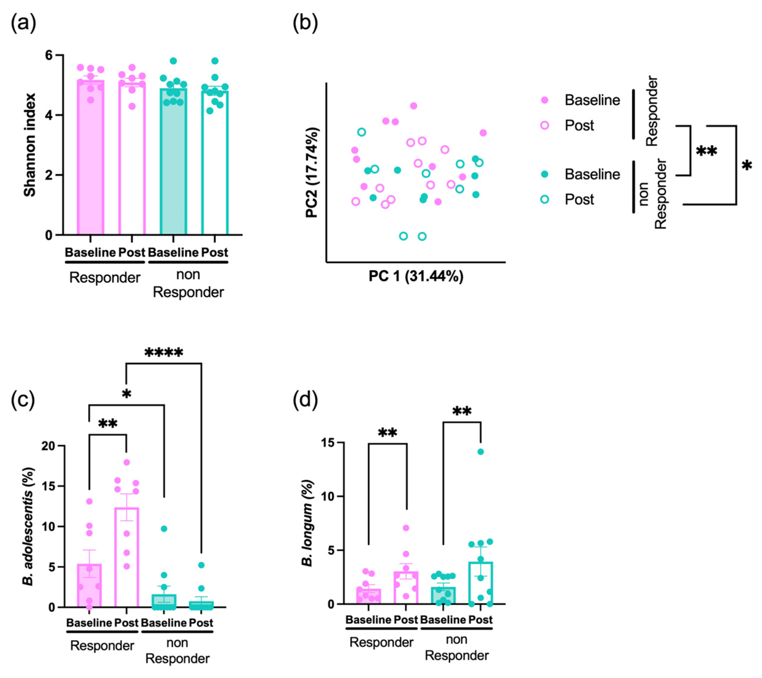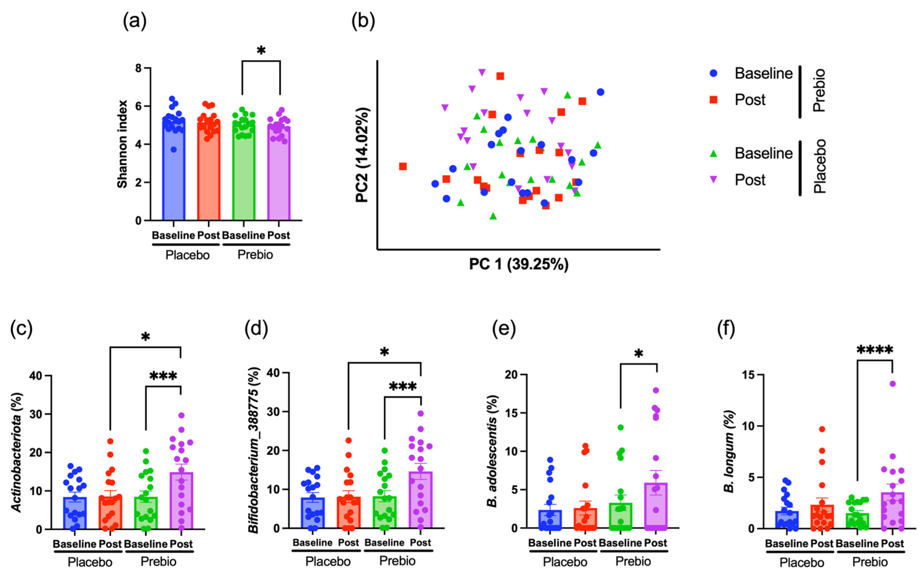 3.2. Baseline and Post-Intervention Fecal Microbiome Diversity and Composition