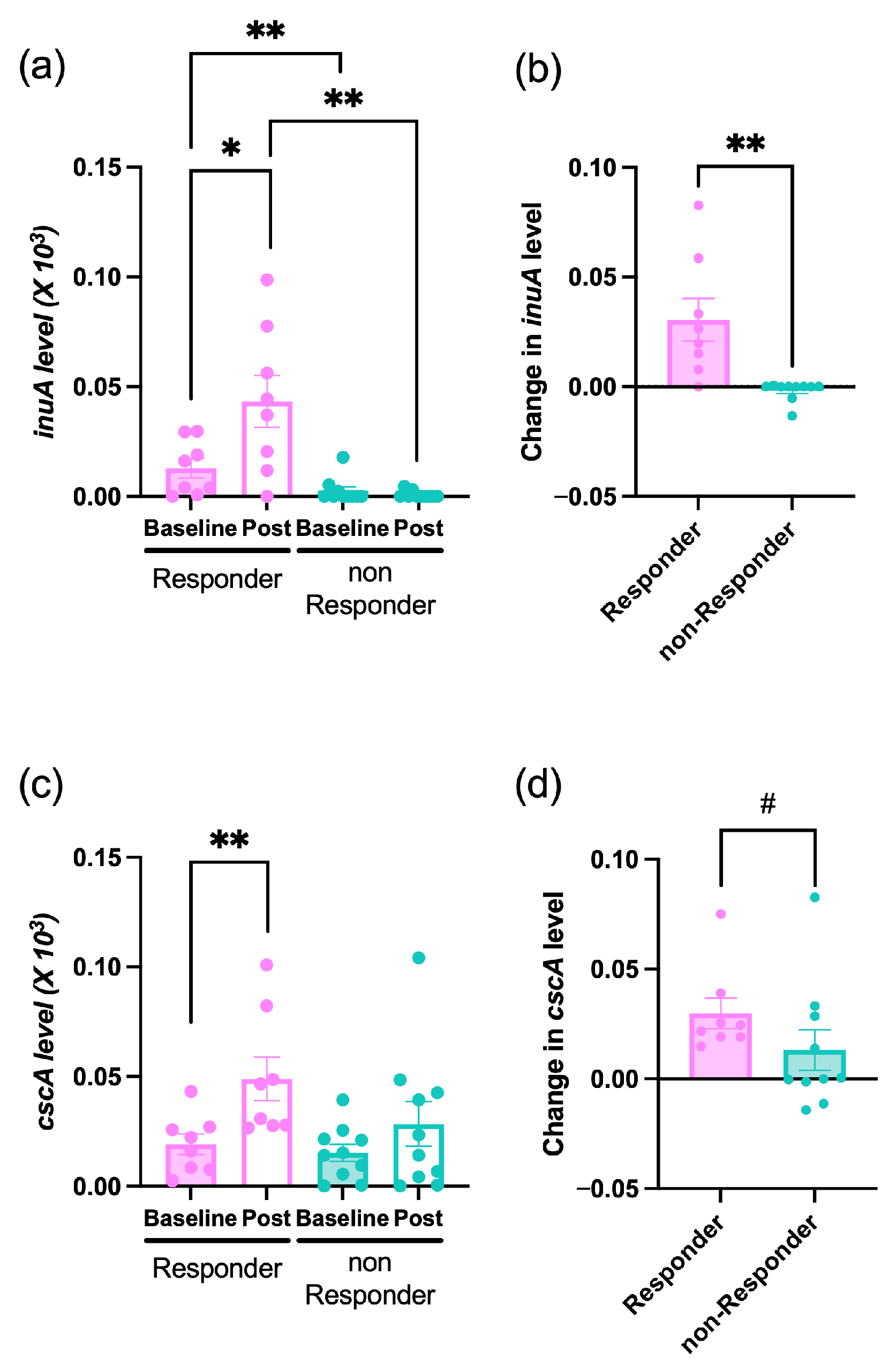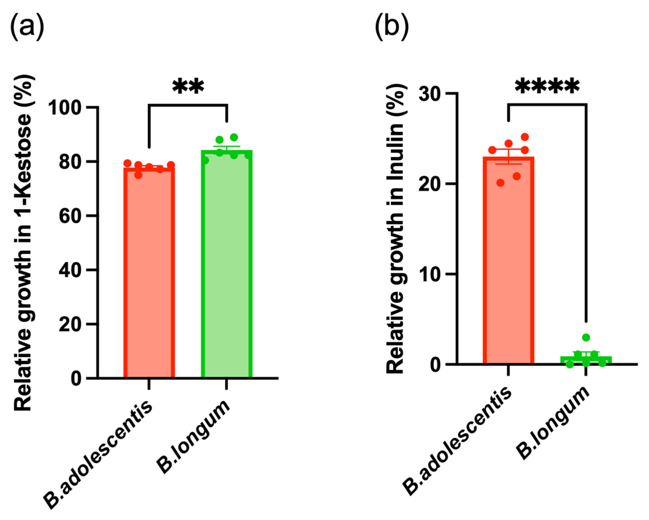 3.4. GH32 Gene Abundance in Responders and Non-Responders and Fructan Utilization by B. adolescentis and B. longum