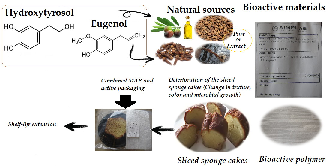 Our study highlights the long-term efficacy of the combination of modified atmospheres and active films in preserving sponge cake over a 70-day period. The presence of a hydroxyl group (-OH) in the structure of HOxTYR and EUG is crucial for their antimicrobial properties [