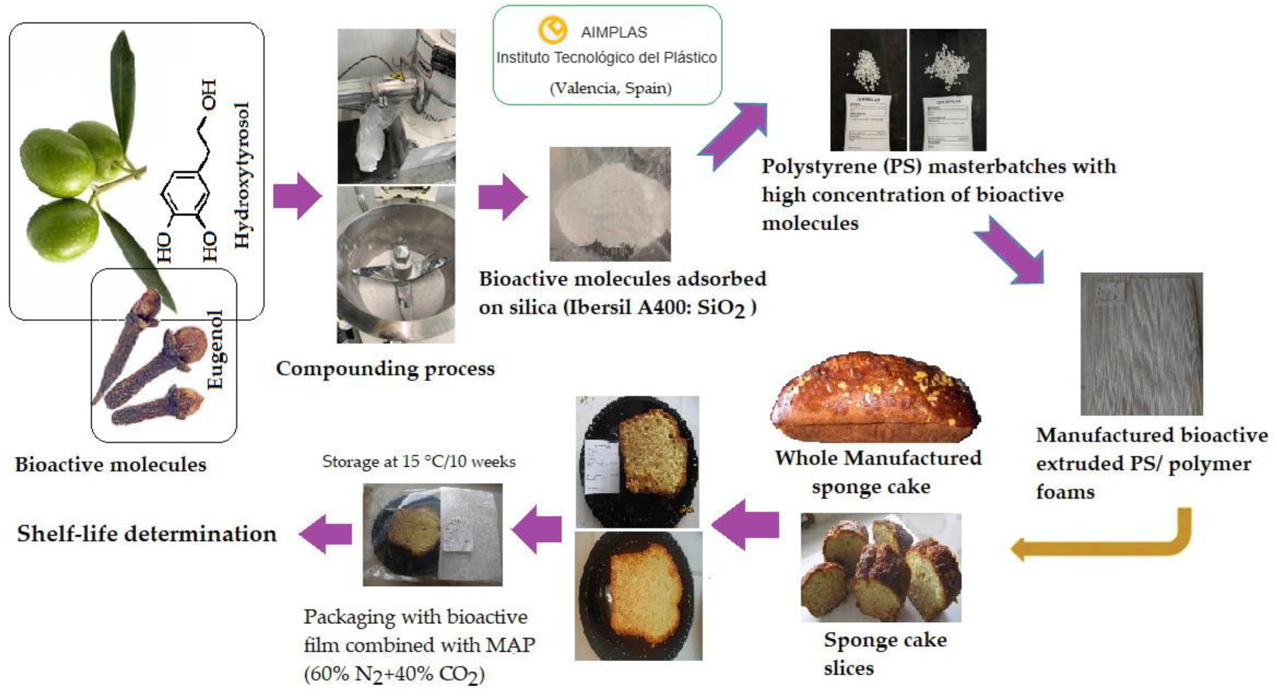 To the best of our knowledge, there are no reported studies regarding the application of PS foamed films enriched with HOxTYR and EUG as active packaging combined with modified atmosphere packaging in the preservation of soft bakery products. Therefore, the primary aim of this study was to develop and evaluate a novel active packaging system for the preservation of sliced sponge cake (SC). This involved three specific objectives: