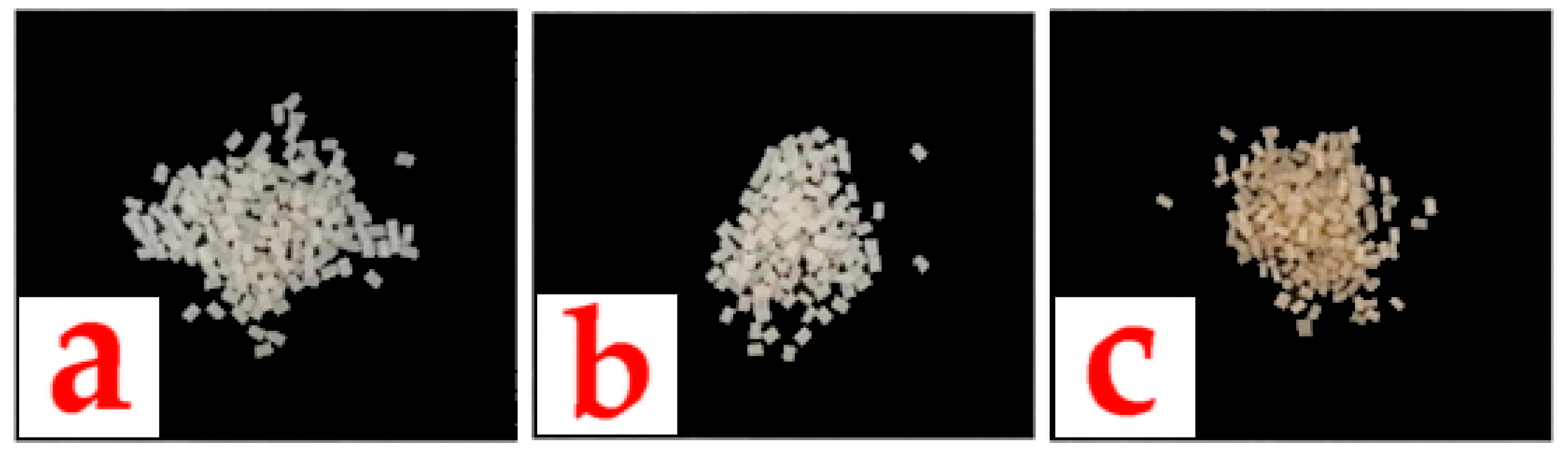 According to the processing conditions, a screw configuration was designed to provide shear to the materials and achieve proper mixing within the extruder between the polymer matrix and the dry blend (inert silica with bioactive compounds). The concentrations of bioactive compounds ranged from 0.6 to 1%, which is the optimal amount for the sponge cake obtained in our study through preliminary tests. The strands coming out of the extruder nozzle were continuously cooled in a water bath and cut into 3 mm long granules, as shown in