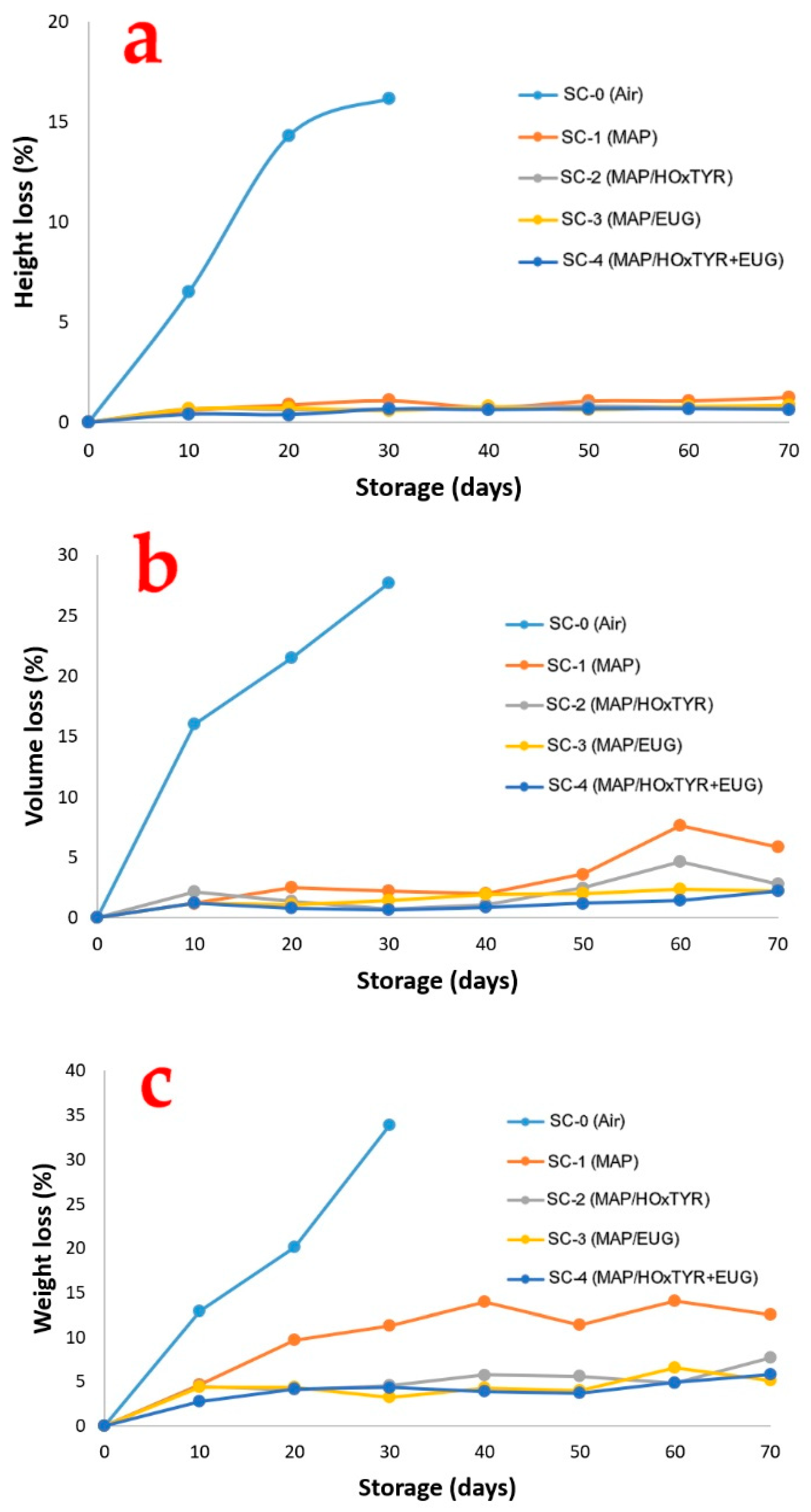 Furthermore, the synergistic application of MAP and active packaging systems showed great potential to delay microbial growth. At the end of storage, all SC samples packaged with active systems (SC-2, SC-3, and SC-4) showed satisfactory microbiological quality according to established criteria [