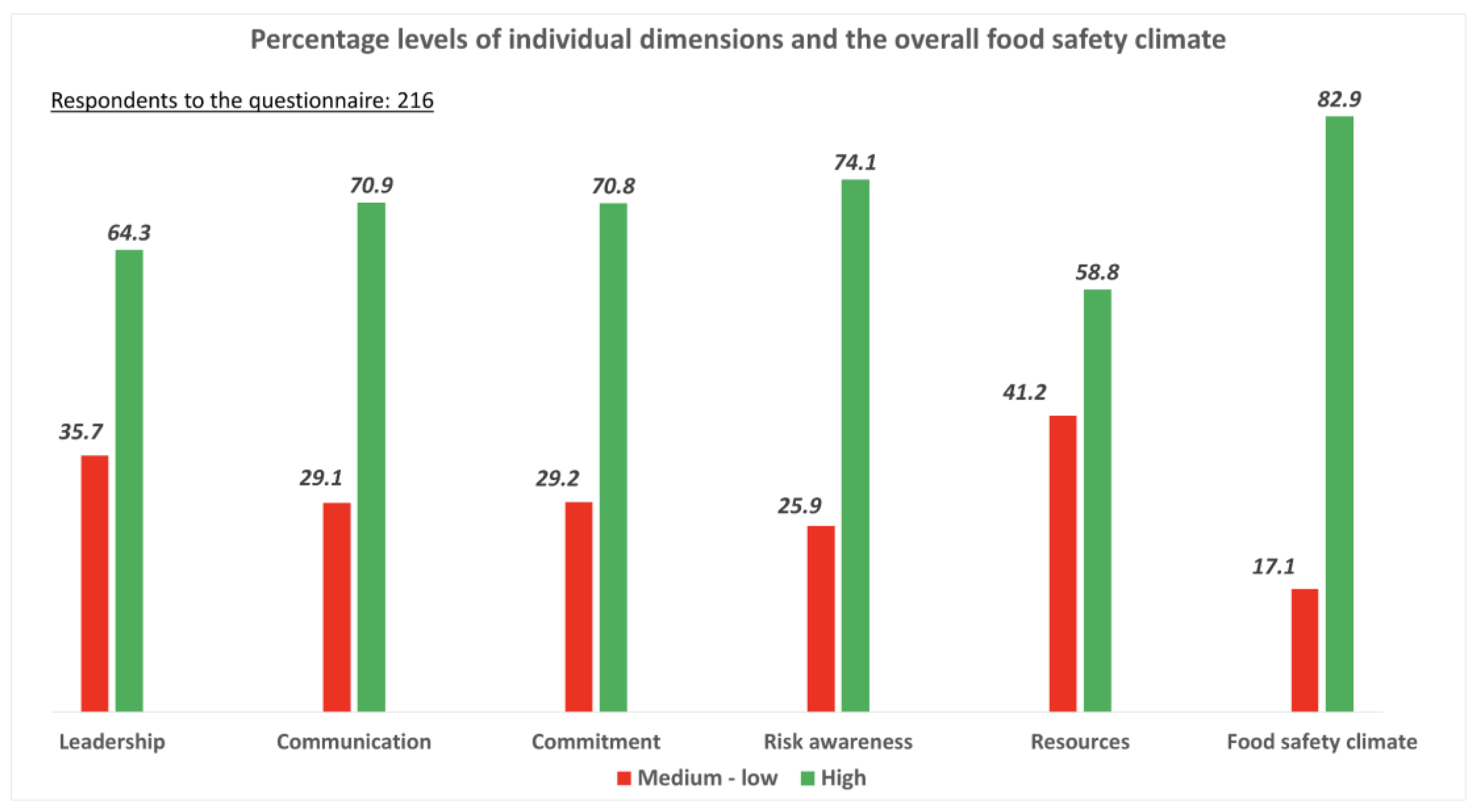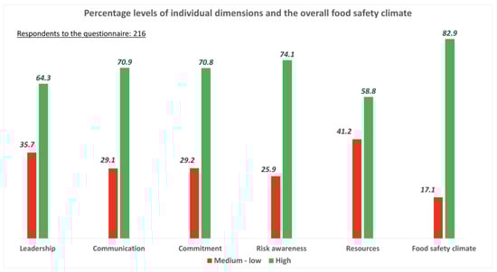 Percentage levels of individual dimensions and De Boeck’s overall food safety climate.