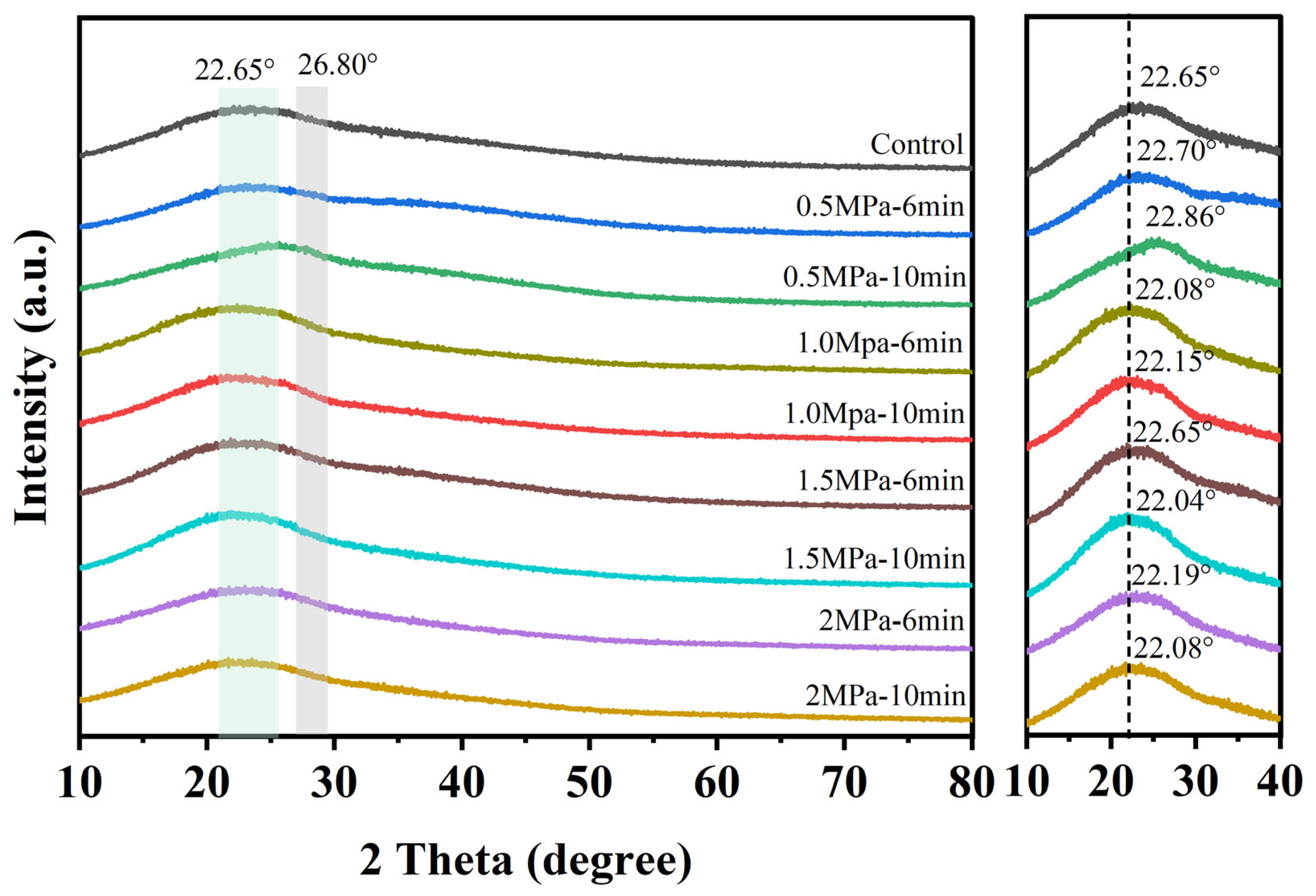 | 0.5 MPa-10 min | 567.59228 ± 11.76504 | 6.83526 ± 0.49375 | 1.16763 ± 0.11876 | 0.99676 |