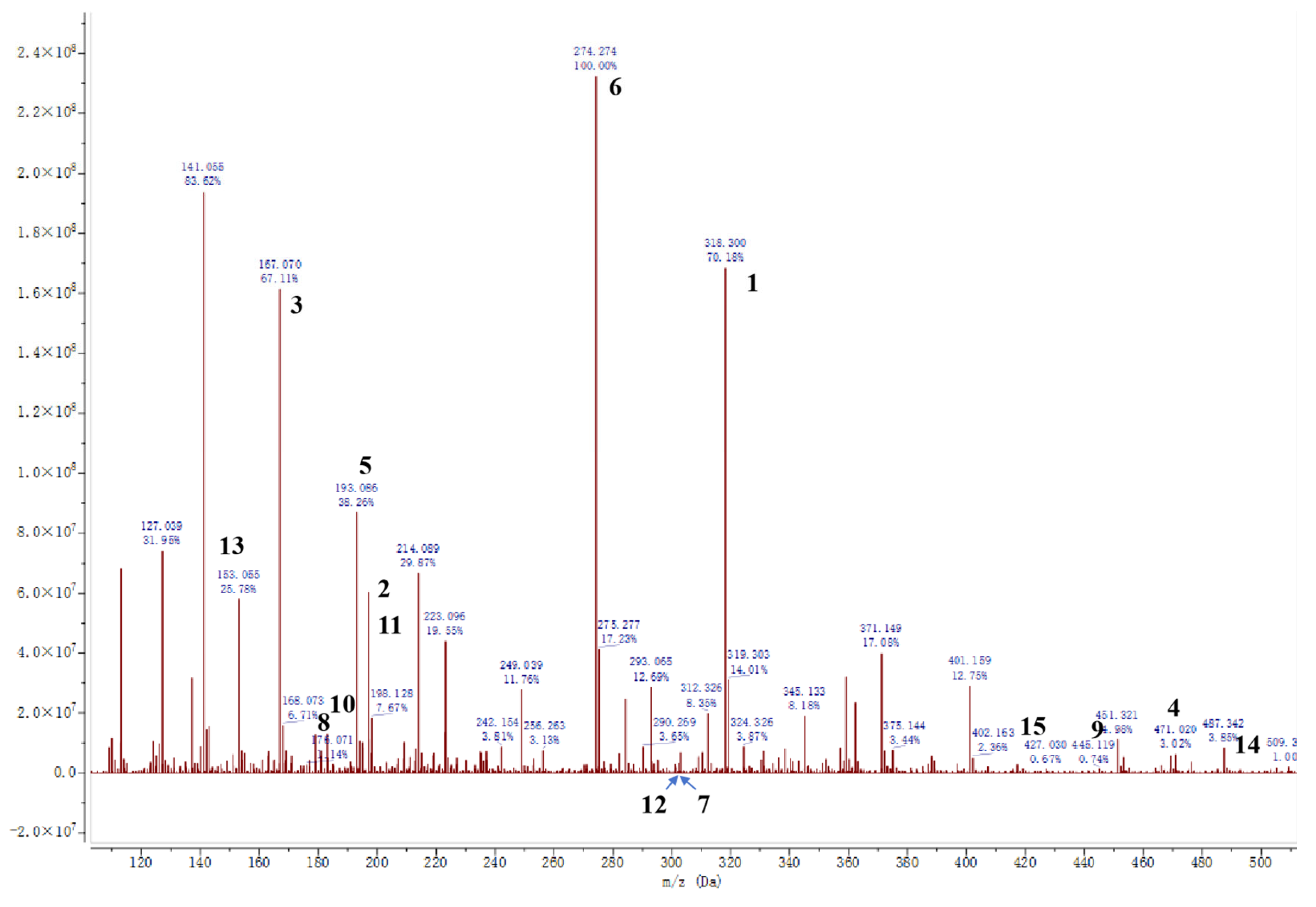 | 1 | Loureirin B | C17H18O5 | Polyphenol | 318.3 | 147.04; 117.03; 108.02 | 1.5 × 1010 |