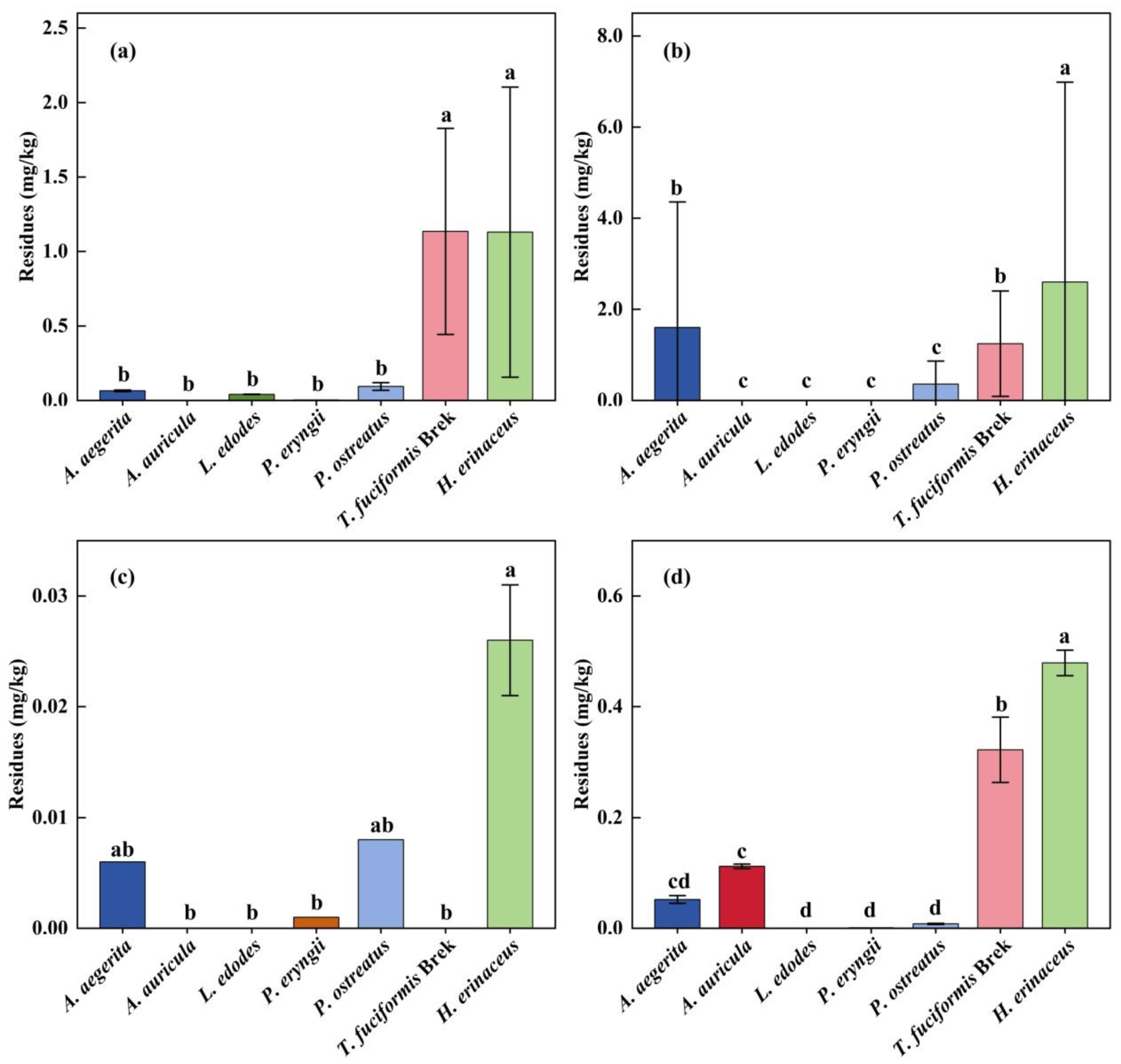 - Yao, Q.; Su, D.; Zheng, Y.; Huang, M.; Chen, M.; Xu, H.; Zeng, S. Risk assessment of multiple pesticide residues in Agrocybe aegerita: Based on a 3-year monitoring survey. Food Chem. X 2024, 22, 101323. [Google Scholar] [CrossRef]