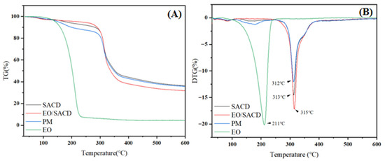 The TG (A) and DTG (B) curves of SACD, EO, EO/SACD and physical mixture of EOs (PM) and SACD.