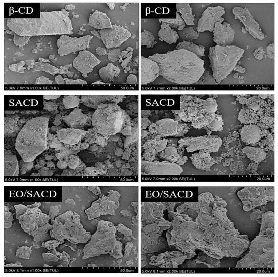 As shown in Figure 5, unreacted β-CD exhibits an irregular block-like morphology with an uneven surface, wrinkles, and sharp edges [47]. After esterification, the cyclodextrin SACD undergoes significant changes, with uneven particle sizes and a tendency for particles to aggregate into clusters [48]. The crystalline structure partially disappears, giving rise to spherical structures, and SACD adopts an amorphous structure. The SEM image of EO/SACD exhibits a structure resembling broken tiles, showing a marked difference from the SEM image of SACD [49]. Aggregation phenomena have disappeared, and the structure is sharper and more compact. The microstructure of EO/SACD has undergone significant changes, indicating that EO has been encapsulated.