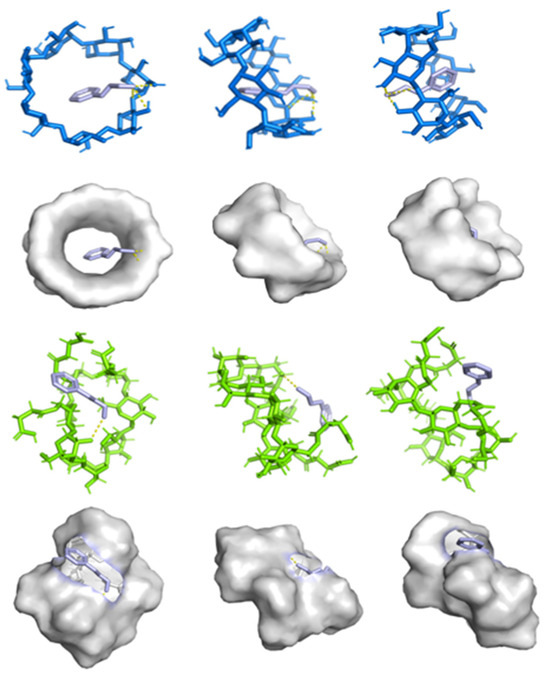 Molecular docking enables the prediction of binding affinity between hydrophobic guest molecules and cyclodextrins, allowing identification of the most stable configuration for the host–guest complex. As shown in Figure 6, it can be observed that cinnamaldehyde molecules enter the hydrophobic cavities of β-CD and SACD through their broad ends via hydrogen bonding interactions, with minimum binding energies of 3.6 kcal/mol and 3.4 kcal/mol, respectively. This indicates the formation of a stable inclusion complex, whose stability arises primarily from the formation of hydrogen bonds. Notably, our molecular simulation results are consistent with the experimental data obtained earlier. The binding energy of SACD after embedding essential oil is negative, indicating that the binding is stable [48].