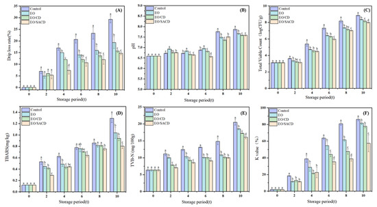 Changes in quality indicators of grass carp during storage at 4 °C for 0–10 days. (A) Drip rate, (B) pH, (C) Total volatile hydrocarbons, (D) Peroxide value, (E) Total volatile basic nitrogen, (F) K value. Note: all above data were mean ± standard error. a–d the different letters mean the significant difference (p < 0.05).