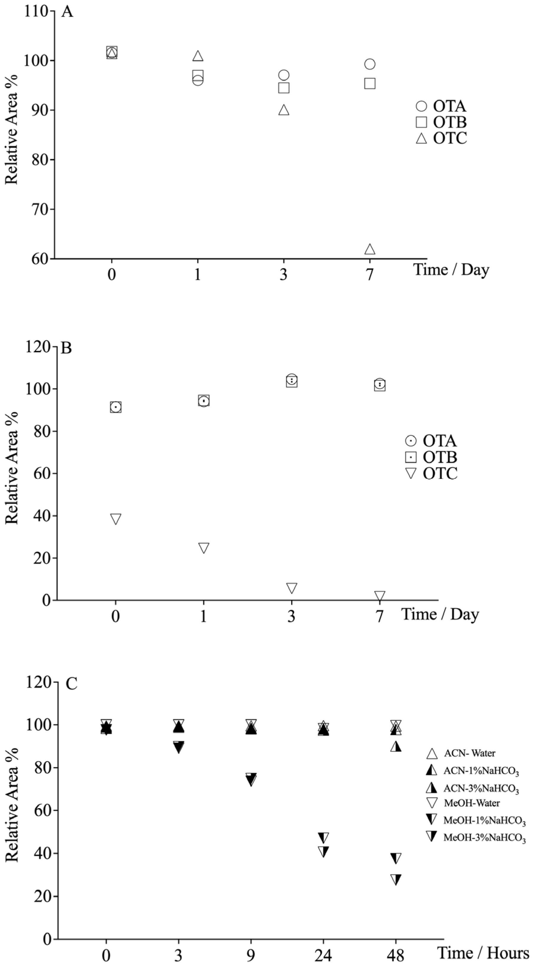 | OTA/OTB/OTC | ACN-water (8/2, v/v) | IAC | Coffee and spices | LC-MS/MS HPLC-FLD | 0.1; 0.3 | 0.3; 1 | This study |