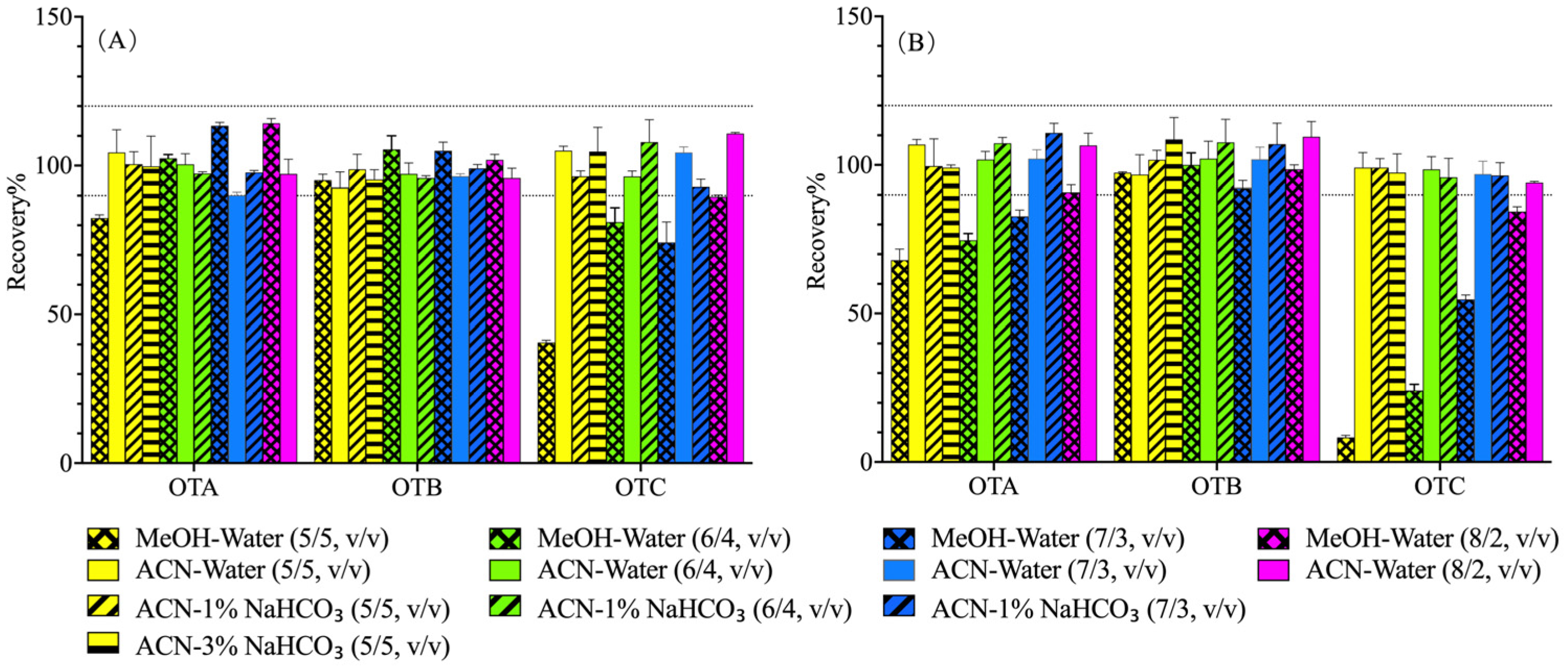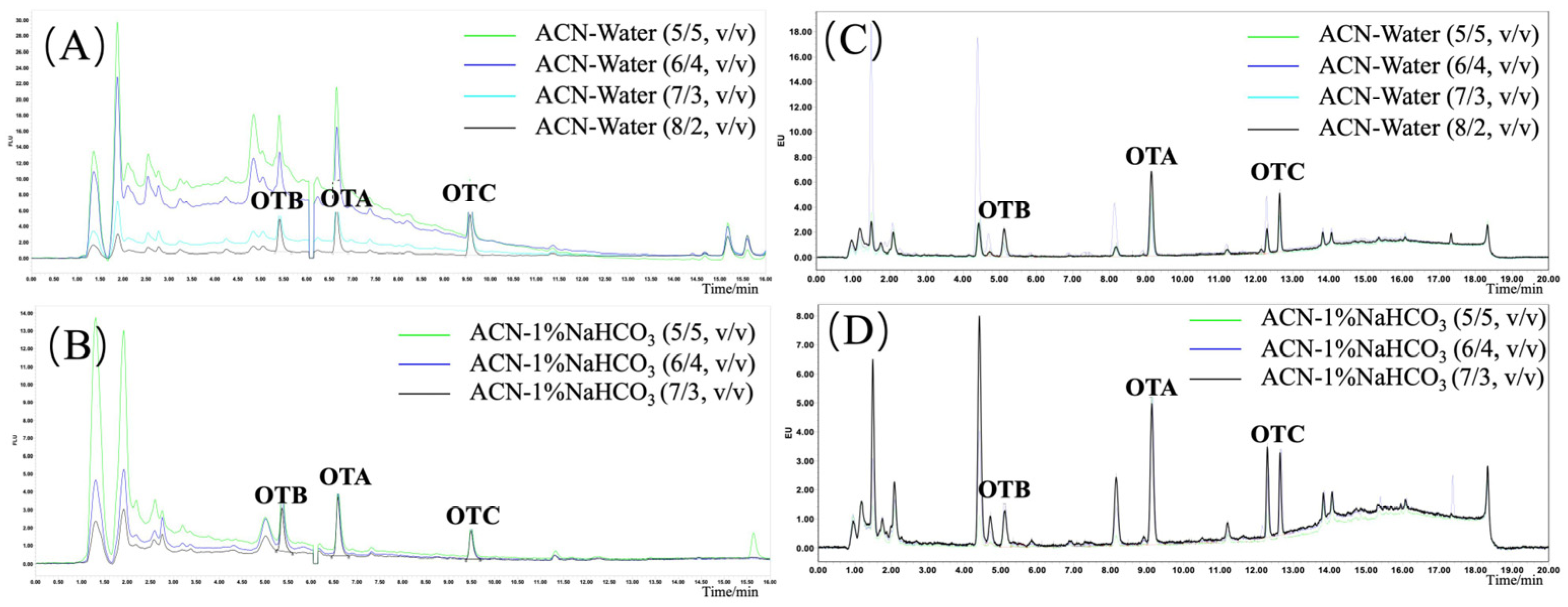 3.1. Optimization of Extractive Solvents on Ochratoxin Recovery