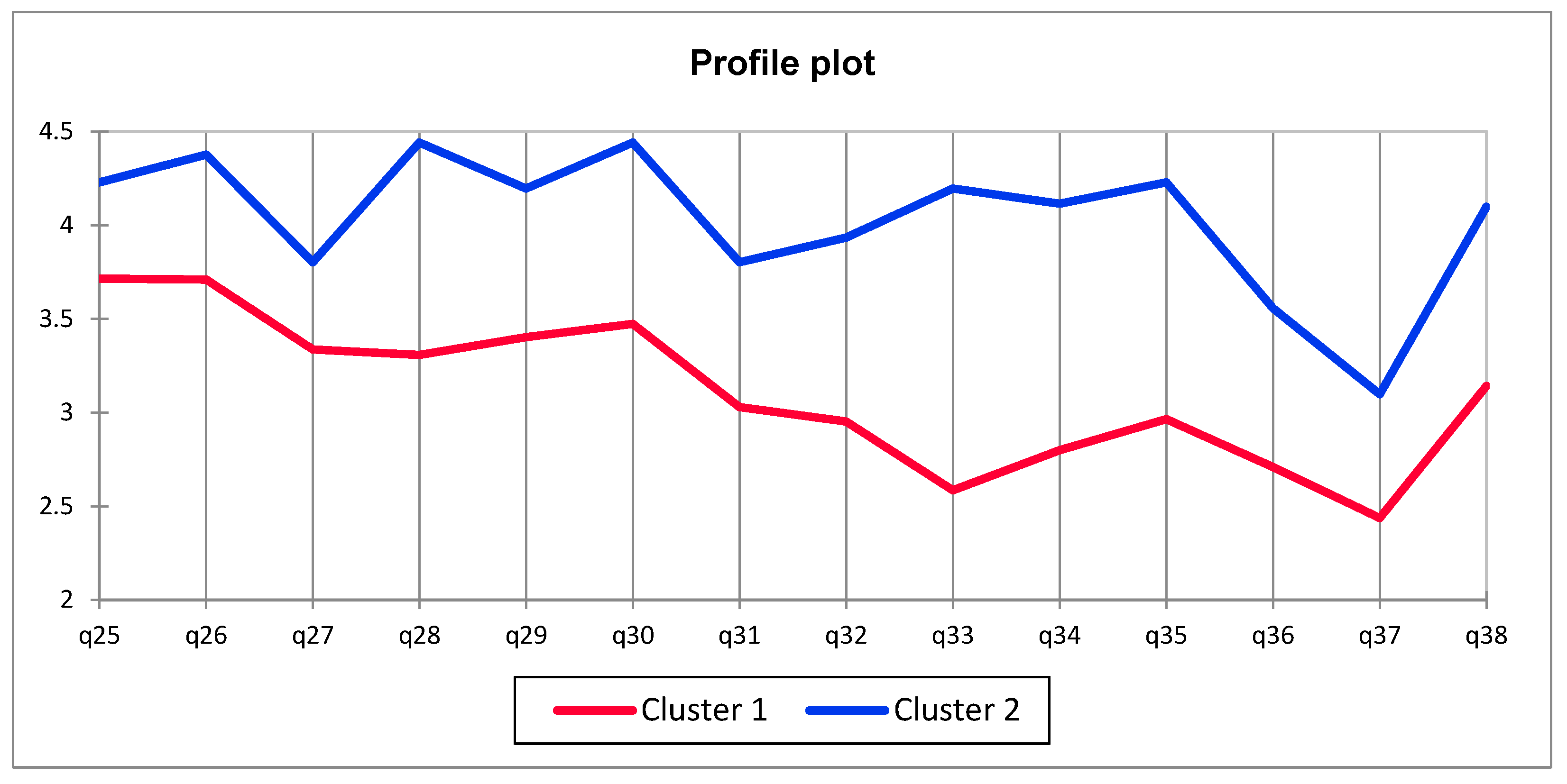 | Cluster 2SQ | Consumers are more engaged with environmental actions | 30.8 | 16.5 | 32.9 | 0.344 | 0.012 * | 0.150 |