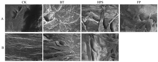In this study, we observed the microstructures of the caps and stalk of L. decastes cooked by three different methods (Figure 1). The results showed that different cooking methods had a significant impact on the microstructure of L. decastes. The surface of the CK cap is smooth with few wrinkles, the stalk tissue structure is dense, and the fibers are evenly distributed. FP completely destroyed the cap and stalk structure, forming a large number of irregular fragments with diameters ranging from 50 to 200 µm. This treatment exposed numerous fresh fracture surfaces, significantly increasing the specific surface area, and some pore structures could be observed on the fragments. BT caused wrinkles on the surface of the cap, blurred pore edges, and caused a reduction in diameter to 3–5 µm. The fibrous structure on the stalk surface contracted due to thermal denaturation, and the spacing decreased. HPS caused the cap surface to present a unique honeycomb-like porous structure with pore diameters ranging from 20 to 50 µm. The edges were irregular and interconnected, forming a network similar to a “sponge-like” structure, and caused cracks about 100 to 200 µm deep to appear on the stem surface.