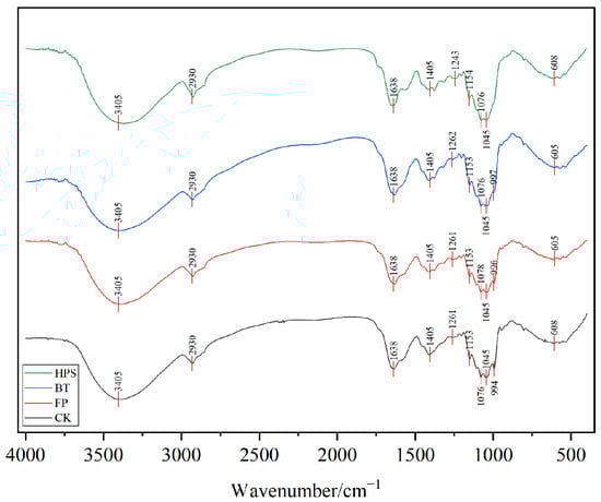FTIR analysis (400–4000 cm−1) confirmed that the infrared spectra of fresh L. decastes treated by FP, BT, and HPS were consistent with CK (Figure 2). This indicates that none of the three treatments altered the characteristic functional groups of L. decastes. A broad and intense peak appeared at 3405 cm−1, corresponding to the stretching vibration of O-H bonds. This suggests strong intermolecular and intramolecular interactions between polysaccharide chains and phenolic compounds []. A narrow and weak peak near 2930 cm−1 was attributed to the stretching vibration of C-H bonds [], mainly derived from lipids and polysaccharides. The sharp absorption peaks in the range of 1760–1600 cm−1 belonged to the stretching vibration of C=O in carbonyl compounds, which may be associated with the high content of ketone compounds [] or proteins in the samples—consistent with the high protein content of L. decastes []. The peak around 1260 cm−1 was attributed to C–O stretching in acetyl groups or other related compounds. The significant absorption at 1150–1030 cm−1 corresponded to the stretching of C-O and C-C bonds or the bending of C-OH groups [,], mainly originating from cell-wall chitin and polysaccharides. The peaks in the range of 350–600 cm−1 corresponded to the skeletal ring vibration of pyranose []. These results indicate that L. decastes is mainly composed of polysaccharides, proteins, lipids, and chitin.