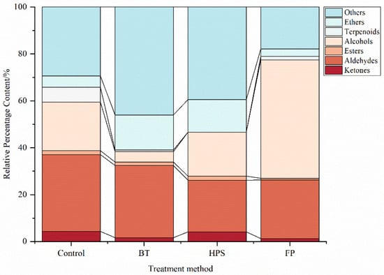The proportions of VOCs in L. decastes samples treated with different methods are shown in Figure 3. Among these four samples, aldehydes and alcohols had relatively high contents and are the major VOCs in L. decastes. These results are consistent with those of Yang et al. []. Aldehydes accounted for 32.78%, 24.94%, 30.77%, and 22.10% of the total VOCs in CK, FP, BT, and HPS, respectively. Alcohols accounted for 20.8%, 50.51%, 4.43%, and 18.74% of the total VOCs in CK, FP, BT, and HPS, respectively. The proportion of alcohols was relatively low in BT and slightly decreased in HPS as well. The possible reasons for these phenomena can be summarized as follows: (1) This may be because low-boiling-point alcohols volatilize significantly with water vapor during heating, resulting in a reduction in their residual amounts in the food []. (2) Alcohols degrade during boiling and are oxidized to aldehydes or ketones upon contact with oxygen. In contrast, HPS improves the heat transfer efficiency of steam through high pressure, enabling the interior of L. decastes to quickly reach the treatment temperature (121 °C) and avoiding the continuous oxidation of alcohols caused by long-term low-temperature preheating []. (3) The honeycomb structure formed in L. decastes by HPS can create “local retention spaces”, slowing down the volatilization rate of alcohols with steam, whereas the BT group exhibits dense tissue due to fiber shrinkage, making alcohols more likely to directly volatilize.