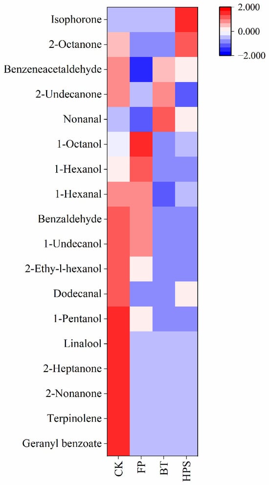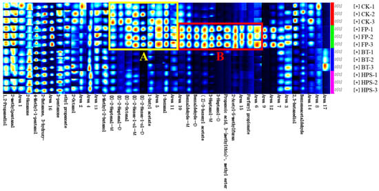 To illustrate the differences in volatile profiles among the samples, characteristic fingerprints were established (Figure 5). Each row in the figure represents a sample or all signal peaks selected during processing. As shown in Figure 5, there were significant differences in the VOCs of the four different flavor samples. The peak signal intensity of VOCs in region A was significantly reduced after BT or HPS treatment. In contrast, the peak signal intensity in region B was significantly increased after FP treatment but remarkably decreased following BT or HPS treatment. Five compounds, namely, (E)-2-hexen-1-ol, (E)-2-heptenal, (E)-2-octenal, 1-butyl acetate, and 1-hexanal, were identified in region A. Among these, (E)-2-heptenal, (E)-2-octenal, 1-butyl acetate, and 1-hexanal contribute almond, fat, dandelion, and fruit odors to the CK and FP groups, respectively. In region B, six compounds—benzaldehyde, (Z)-3-hexenyl acetate, 3-heptanol, 2-acetyl-5-methylfuran, propanoic acid, 3-(methylthio)-, methyl ester, and furfuryl propionate—were identified, endowing the FP group with a complex and layered flavor profile featuring notes of bitter almond, herb, vegetable, nut, tropical fruit, floral, and spicy aromas. In addition, CK, FP, BT, and HPS samples also contained relatively high contents of 2-octanol, benzeneacetaldehyde, 2-methylpentanal, ethyl propanoate, and 3-hydroxy-2-butanone. These compounds impart fat, berry, apple, and butter aromas to the four types of samples.