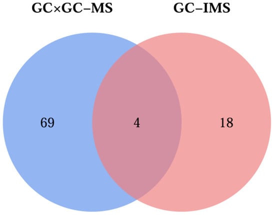 Both GC×GC-MS and GC-IMS have their own advantages in detecting VOCs. GC×GC-MS separates VOCs through two-dimensional column (SH-Rtx-5sil MS and BPX-50) chromatography and programmed temperature ramping (40–230 °C). Qualitative analysis is then performed by matching mass spectra to standard libraries (e.g., NIST) and interpreting fragment ions. In contrast, GC-IMS uses a single column, and the drift tube temperature of the ion mobility spectrometer (IMS) is fixed (45 °C). Qualitative analysis relies on detecting the ion drift time and retention time in an electric field, then matching to a custom-built IMS library.