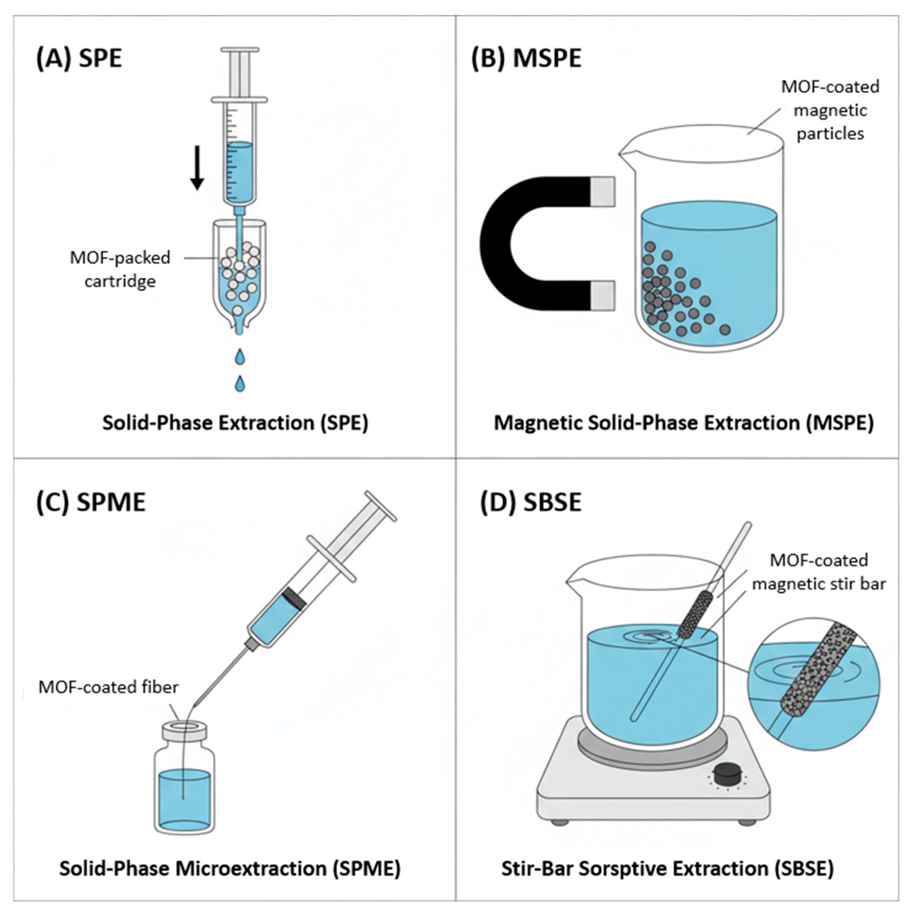 20]. MOFs, acting as advanced sorbents, have demonstrated exceptional performance in various extraction techniques due to their high adsorption capacities and selective recognition abilities, which can be tailored through pore engineering and post-synthetic modification.