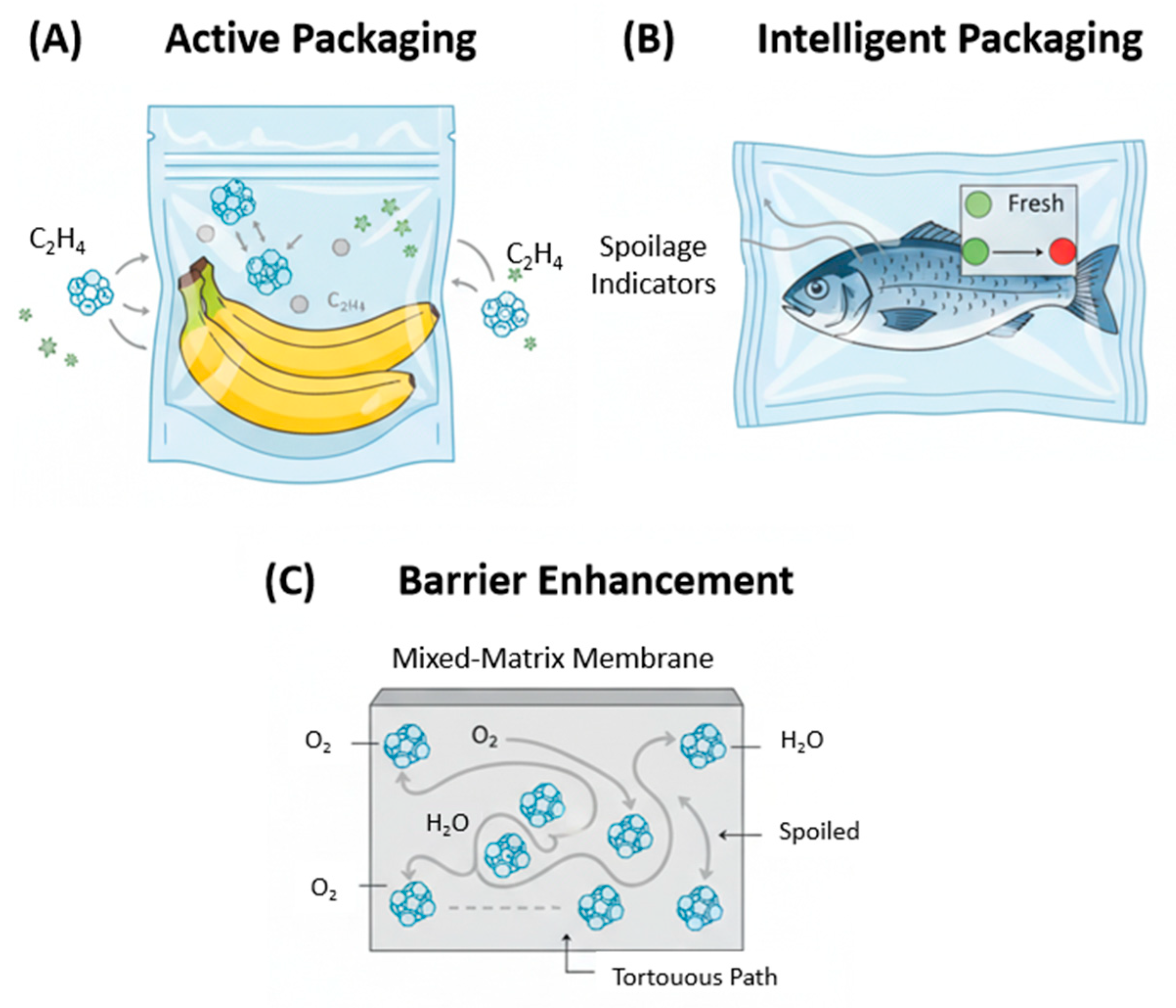 4]. Similarly, conventional food preservation and packaging technologies, while effective to an extent, often lack active functionalities, such as the ability to regulate ripening gases, release antimicrobial agents on demand, or provide real-time feedback on food freshness [