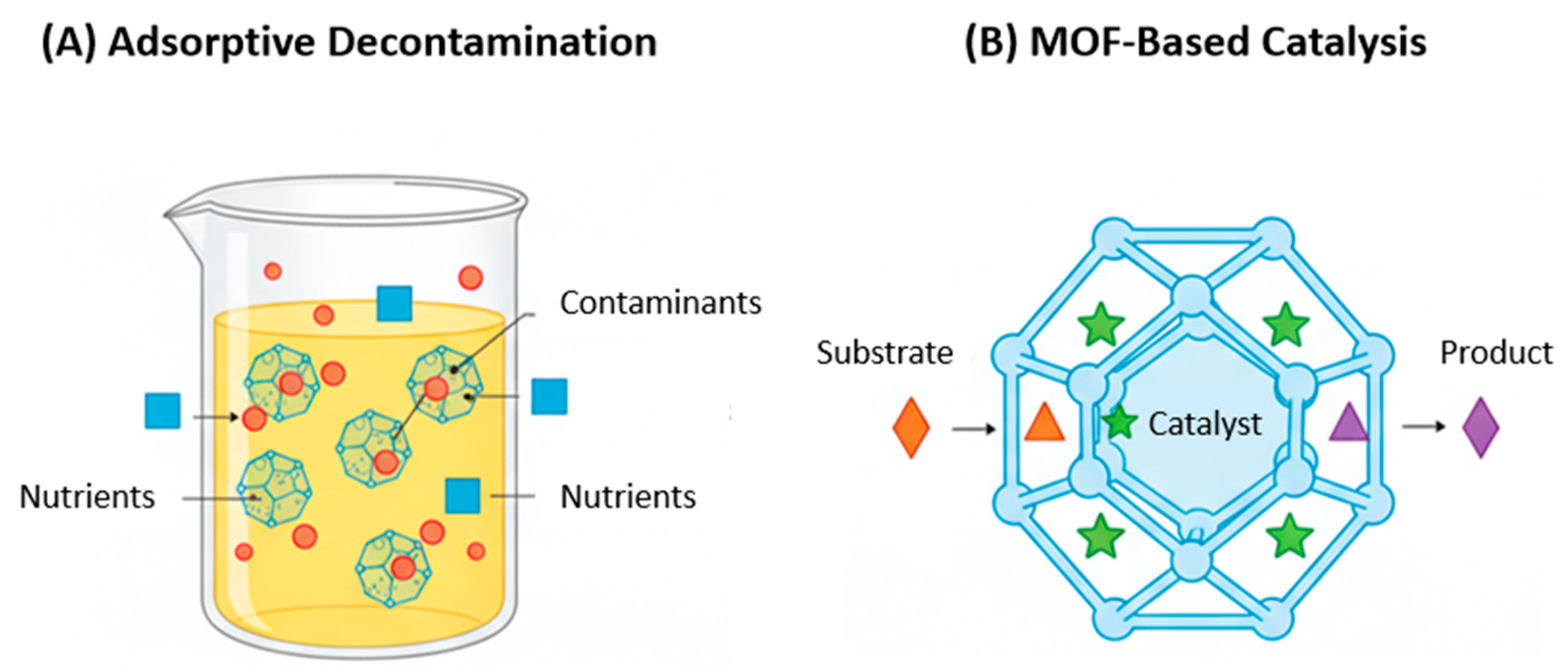 17], they have often focused on a singular domain, such as their role as analytical tools for contaminant sensing or their application in food packaging. The novelty of this review lies in its comprehensive, integrated approach. We aim to provide a holistic “farm-to-table” perspective by connecting the disparate applications of MOFs across the entire food supply chain—from advanced analysis and sample preparation to active packaging, direct food processing, and decontamination. Furthermore, this review places a strong emphasis on the translational challenges and future perspectives, critically evaluating the hurdles of biocompatibility, scalability, cost, and regulatory approval that must be overcome for real-world implementation. By bridging these distinct research areas and focusing on the path to practical application, we intend to provide a unique and valuable resource for both materials scientists and food technology experts.