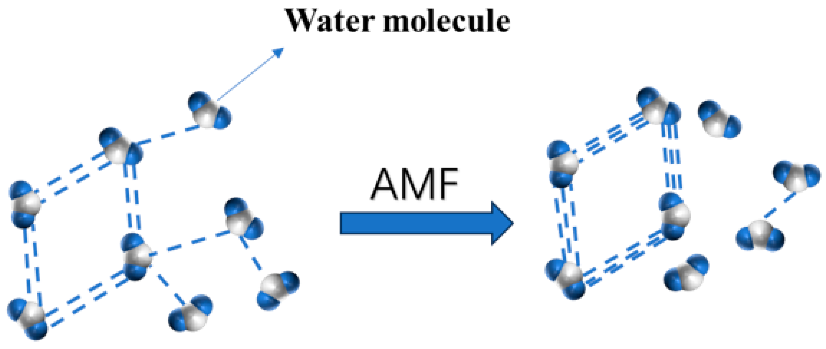 The mechanism of the influence of magnetic fields on food is still incomplete, as indicated by previous studies. Some researchers have proposed that exposure to magnetic fields can alter the growth, viability, and gene expression of specific bacteria, potentially leading to a reduction in microbial populations and slowing the spoilage processes of food [6]. When temperatures fall below a critical threshold or when thermal vibrations are suddenly diminished, instantaneous crystallization may occur, resulting in the formation of numerous small ice crystals. Moreover, as illustrated in Figure 1, the application of a magnetic field strengthens the hydrogen bonds, causing the weaker bonds to break, which results in larger clusters of water molecules breaking into more tightly bound, smaller clusters. Consequently, during the freezing phase transition, this leads to the formation of multiple small ice crystals, thereby minimizing damage to the cellular structure of the sample [7].
