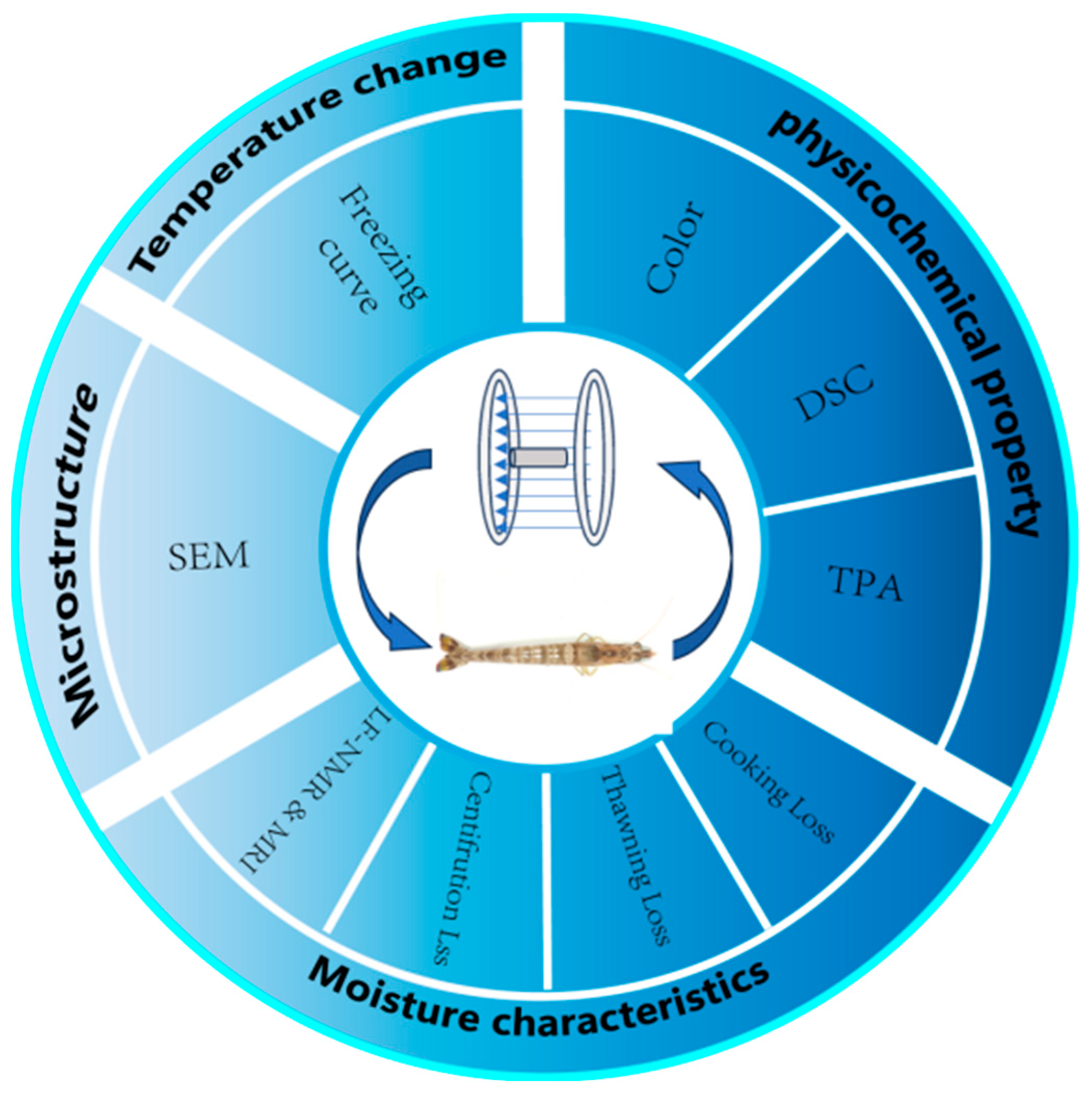 Penaeus Japonicus is notable for its high content of astaxanthin, amino acids, eicosapentaenoic acid (EPA), and essential trace elements such as zinc and iron. The primary approach for preserving the quality of shrimp and other aquatic products involves the application of low-temperature technologies. Exposure to low temperatures inhibits microbial metabolism and significantly suppresses enzymatic activity in food products [1]. However, ice crystal formation during the freezing process can detrimentally affect the quality of frozen products [2], as these crystals may damage muscle fibers and reduce the nutritional value of the samples. To mitigate these adverse effects, researchers are investigating the integration of physical fields—such as ultrasound, high pressure, and microwave energy—with conventional freezing methods [3]. Magnetic field-assisted freezing is one such approach, involving the application of magnetic fields with varying intensities or frequencies in conjunction with traditional freezing techniques [4]. This method has demonstrated potential to accelerate the freezing process, reduce ice crystal size, improve the quality of frozen aquatic products, and extend their shelf life [5].