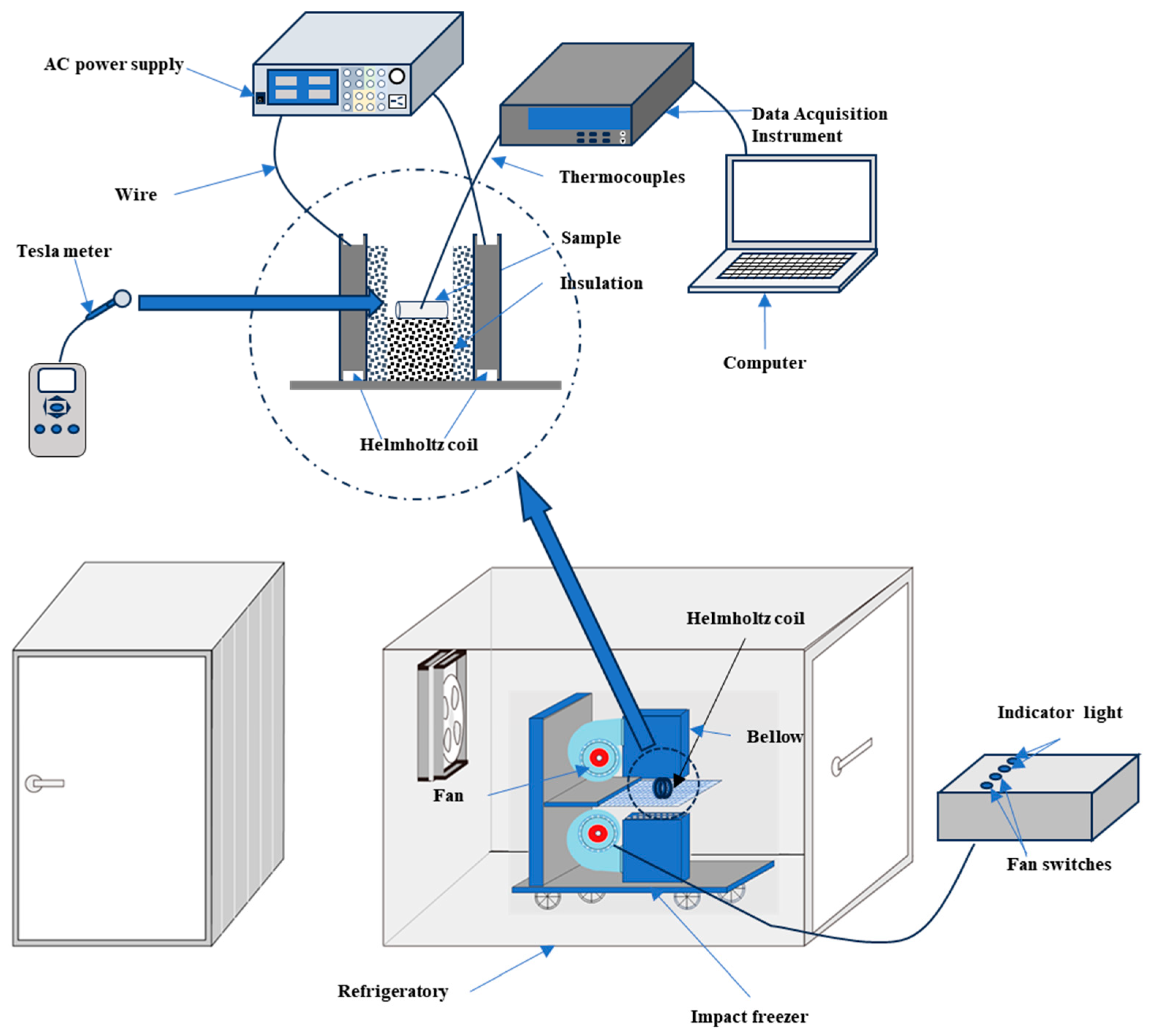 The freezing unit consisted of a cold storage chamber and an impact freezer. The impact freezer directed airflow onto the samples at a wind speed of 2 m/s. The monitoring system included temperature monitoring and magnetic field strength detection. A T-type thermocouple and a data acquisition device were used to measure the temperature at the sample center, with real-time data displayed on a computer. The uniformity and strength of the magnetic field were verified using a TM5100A Digital Tesla Meter (TUNKIA, Changsha, China). The magnetic field strength was monitored indirectly through current measurements.