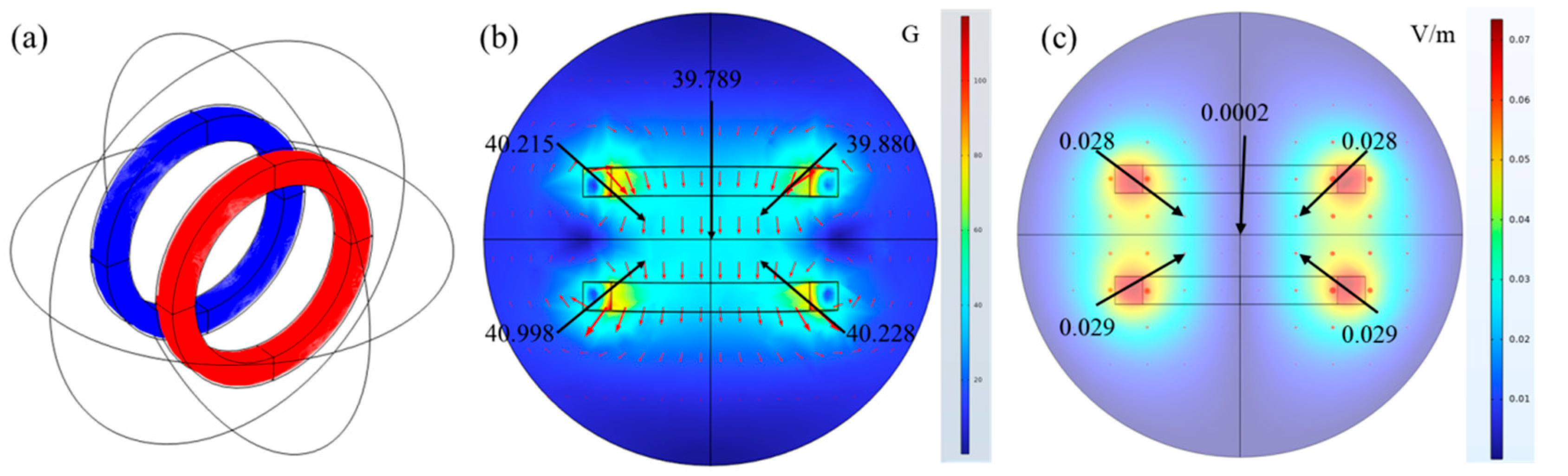 Figure 4. The model of the Helmholtz coil and the magnetic field strength. (a) Schematic representation of the Helmholtz coil; (b) schematic representation of the strength of the Magnetic field at the shrimp freeze position; (c) schematic representation of the strength of the electric field at the shrimp freeze position.