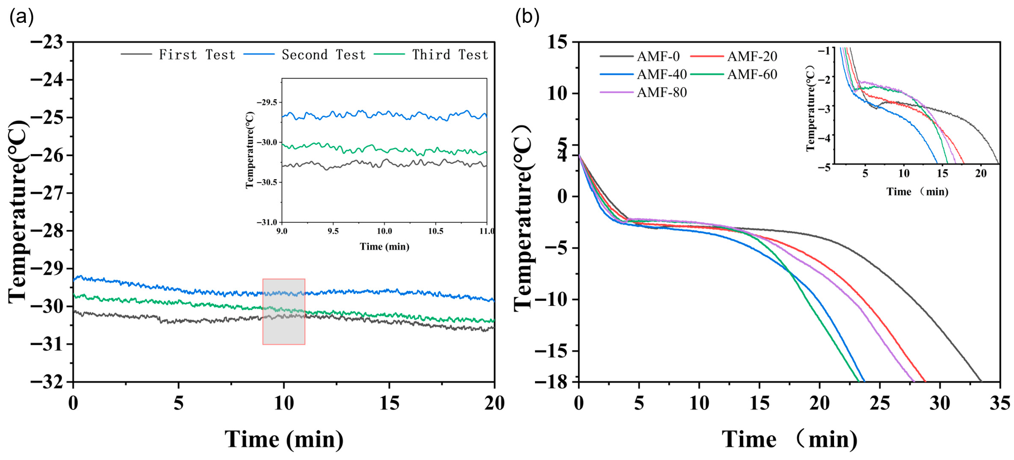 Figure 5. Temperature changes before and after switching the magnetic field (a) and freezing curve (b).