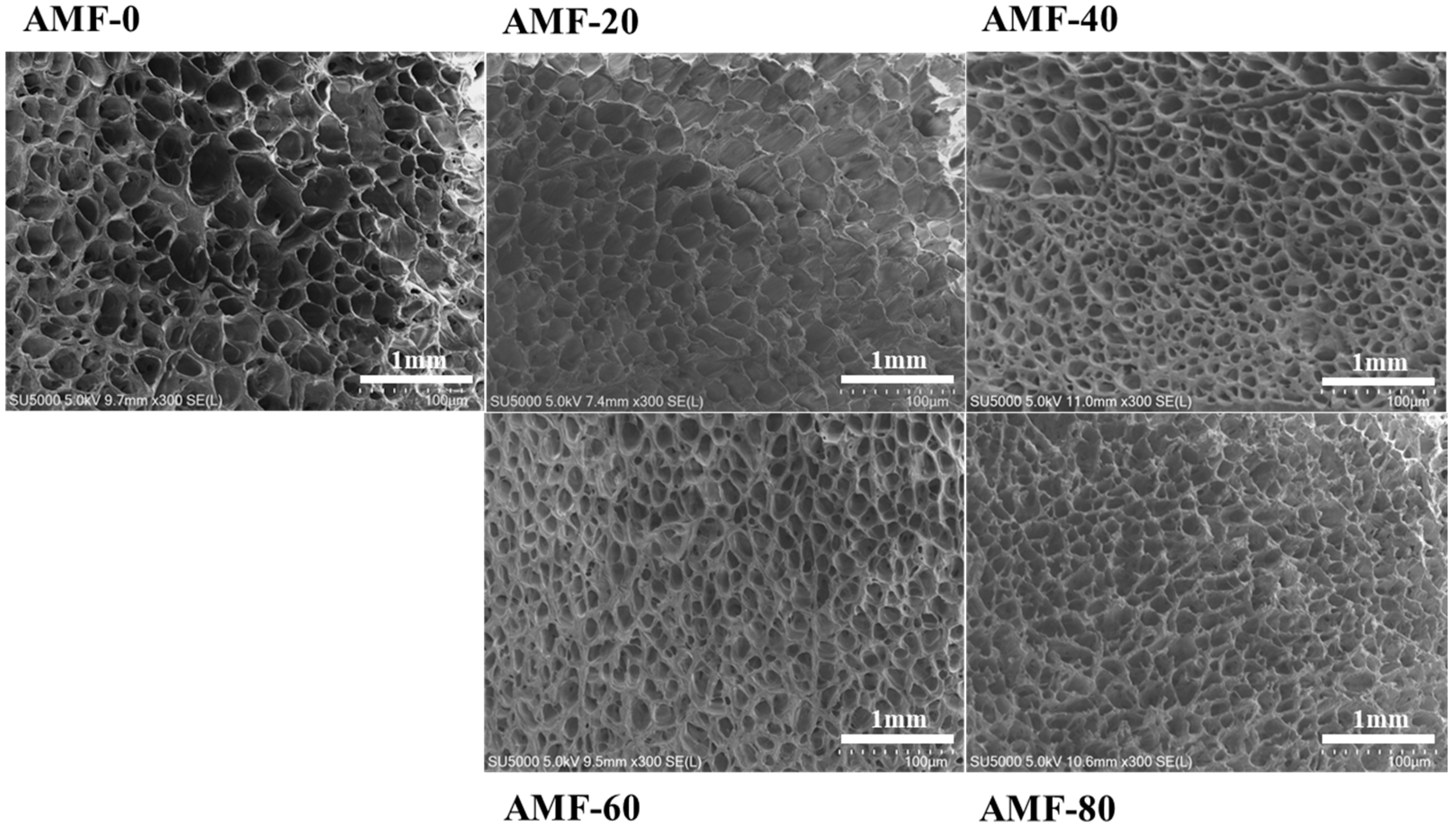 During the freezing process, the barrier effect of the cell membrane and variations in solute concentration cause the initial formation of crystallization nuclei outside the cells. Water within the cells migrates outward due to osmotic pressure and subsequently adheres to the external crystallization nuclei, leading to the formation of ice crystals [20]. As liquid water converts to solid ice, it expands in volume, exerting pressure on the muscle fibers. The structure of the ice crystals is preserved, and they are then subjected to freeze-drying for subsequent examination using scanning electron microscopy (SEM). Consequently, the size of the holes observed in the SEM images corresponds to the size of the ice crystals [21].
