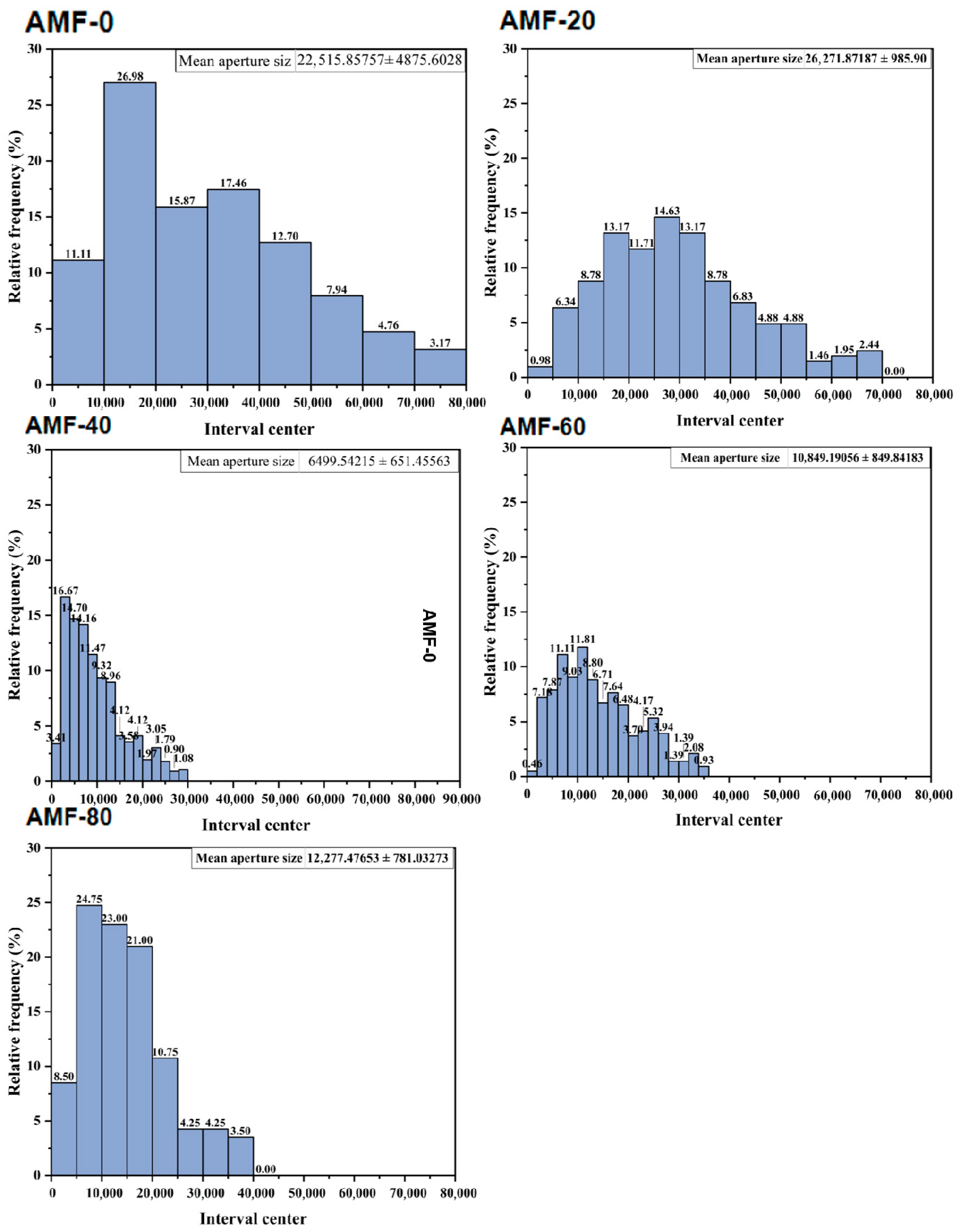 As shown in Figure 6, the AMF-0 group exhibited large, irregular pores that caused damage to the muscle fibers. The histogram in Figure 7 illustrates the distribution of pore areas. The average pore areas, ranked from smallest to largest, are AMF-40, AMF-60, AMF-80, AMF-0, and AMF-20. The difference in pore size between the AMF-0 and AMF-20 groups was minimal. Specifically, the average pore area in the AMF-40 group was 6499. 54 μm2, representing a 71.13% reduction compared to that of AMF-0. In the AMF-20 group, the pores remained large but were more uniform, likely due to reduced osmotic pressure associated with faster freezing. The AMF-40 group demonstrated the fewest pores and the best-preserved muscle fiber structure. Consistent with the freezing curves, the magnetic field intensity in the AMF-40 group accelerated ice crystal formation in Penaeus Japonicus and mitigated cellular structure damage. As the magnetic field intensity increased, pore size initially decreased and then increased. Sun’s experiment reached a similar conclusion: as the magnetic field intensity increases, the sample quality initially improves but subsequently deteriorates. They observed that a 60 mT magnetic field reduced the size of ice crystals and minimized damage to the cellular structure [22]. Liu et al. [23] found that magnetic fields decreased ice crystal size and mitigated muscle fiber damage.