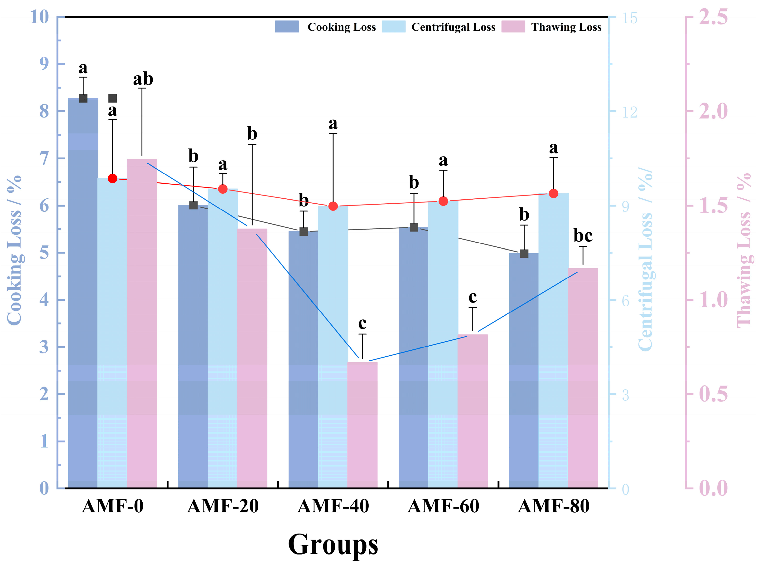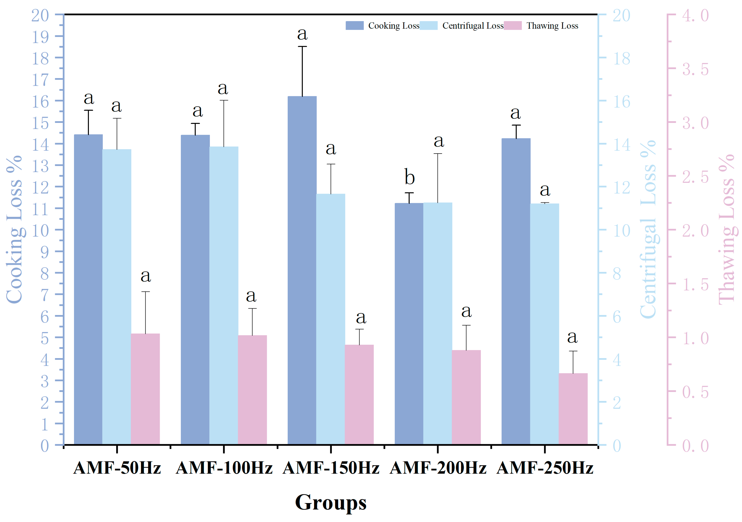 Figure 19. Analysis of Cooking loss (%), centrifugation loss (%) and thawing loss (%) at Different Magnetic Field Frequencies. Note: Repeat the experiment 3 times for each group and different lowercase letters indicate significant differences (p < 0.05).